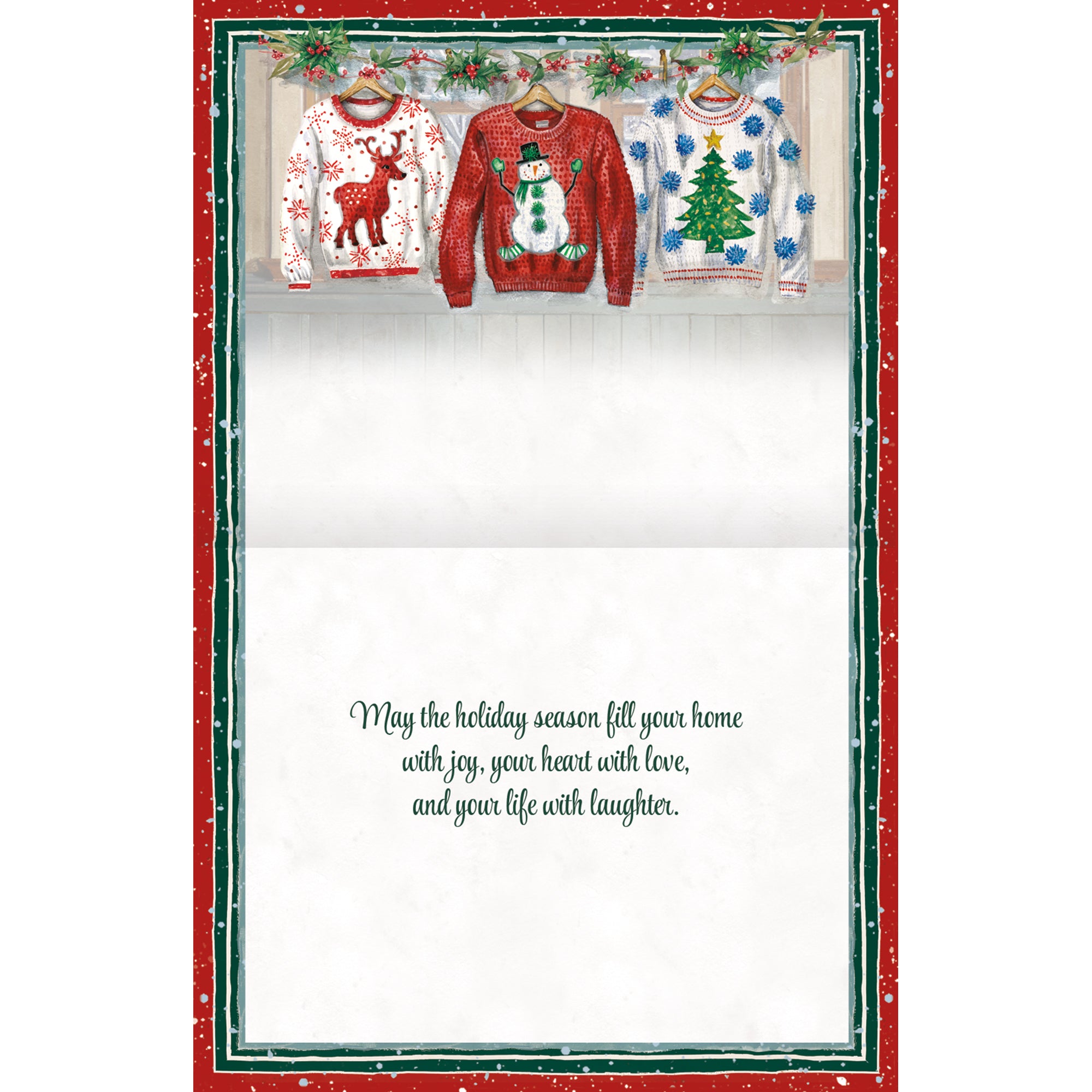 Celebrate the holiday spirit with the Festive Sweaters of the Season Boxed Christmas Cards, featuring delightful artwork by Tim Coffey. These charming cards showcase a variety of cosy winter sweaters, each adorned with traditional holiday motifs such as reindeer, snowmen, and Christmas trees, set against a rustic wooden backdrop. Perfect for sending warm wishes to loved ones, these cards are crafted with LANG's signature linen embossed paper stock and enhanced with shimmering foil embellishments for a touch.