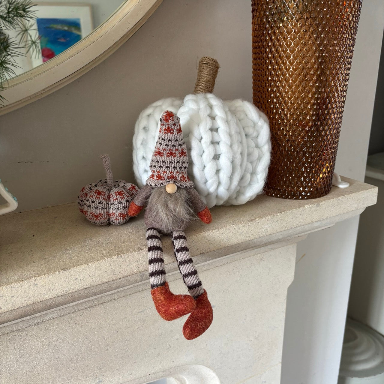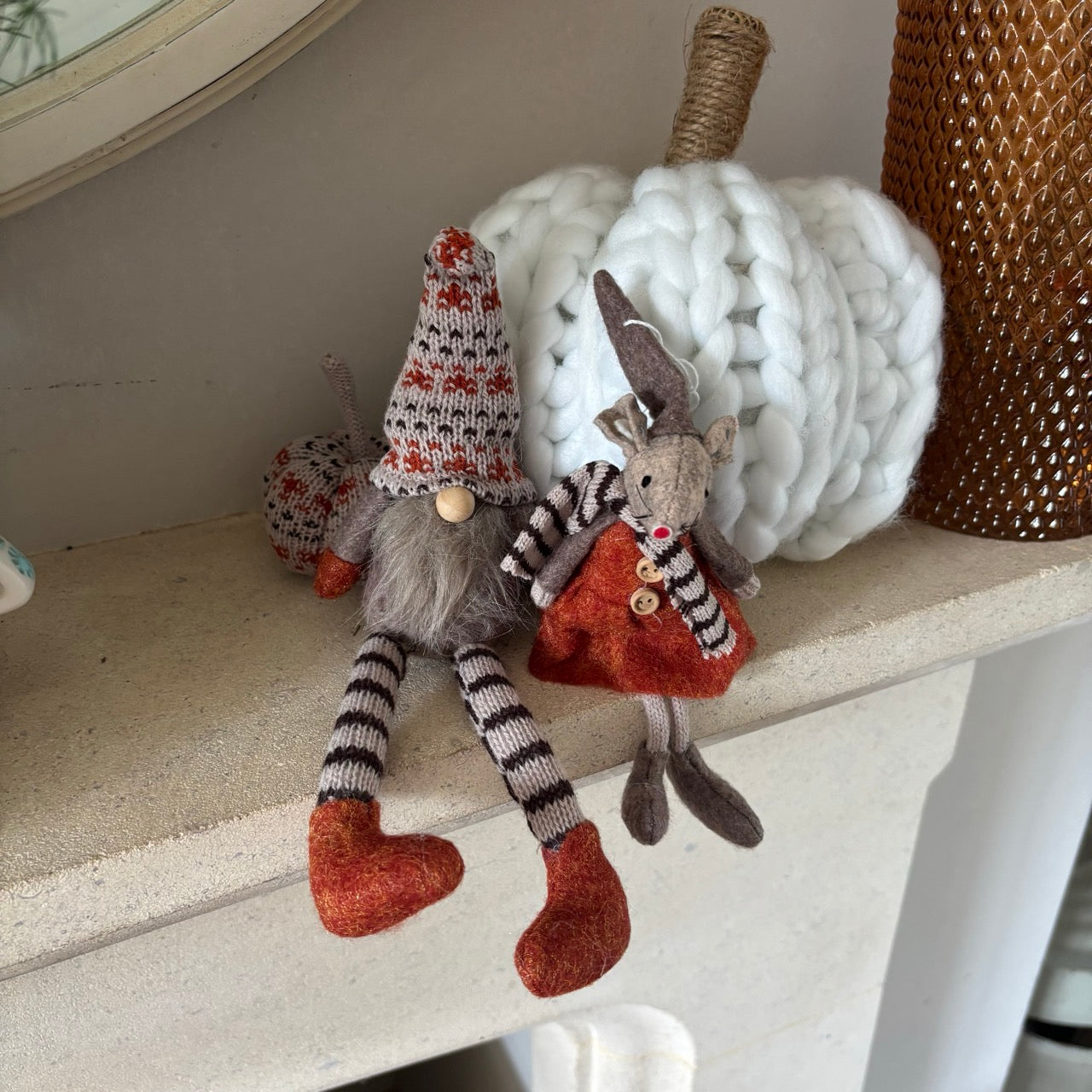 A charming sitting gonk decoration in the warmest burnt orange and beige colours. A must have seasonal decoration with beautiful details including a natural wooden nose, stripy legs and burnt orange booties.