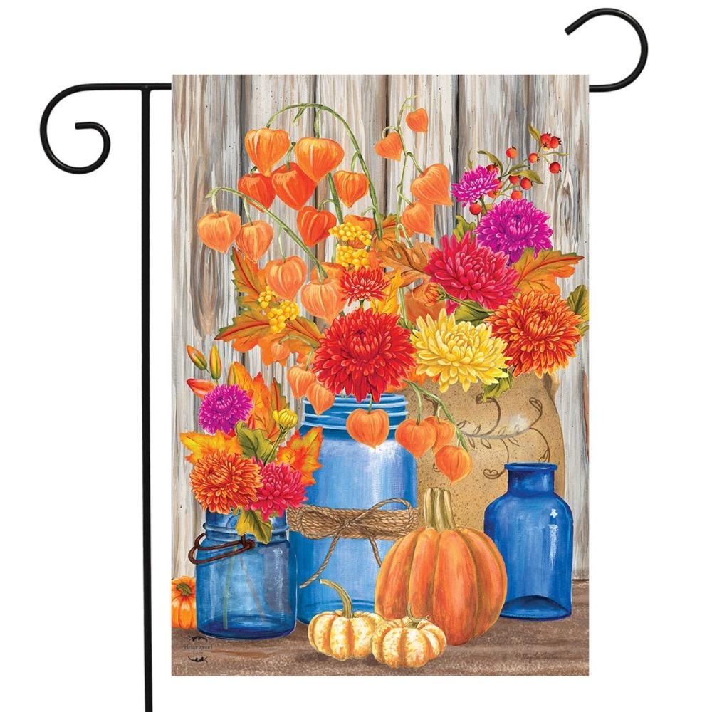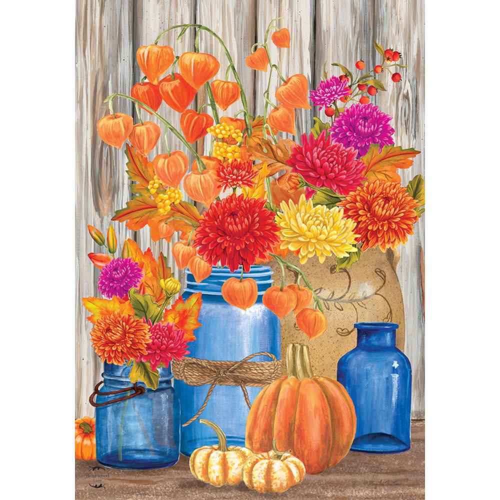Celebrate the best of autumn with this cheerful garden flag featuring seasonal flowers in blue mason jars surrounded by pumpkins. Printed on polyester material designed for durable outdoor display. Flag hanger is sold separately.