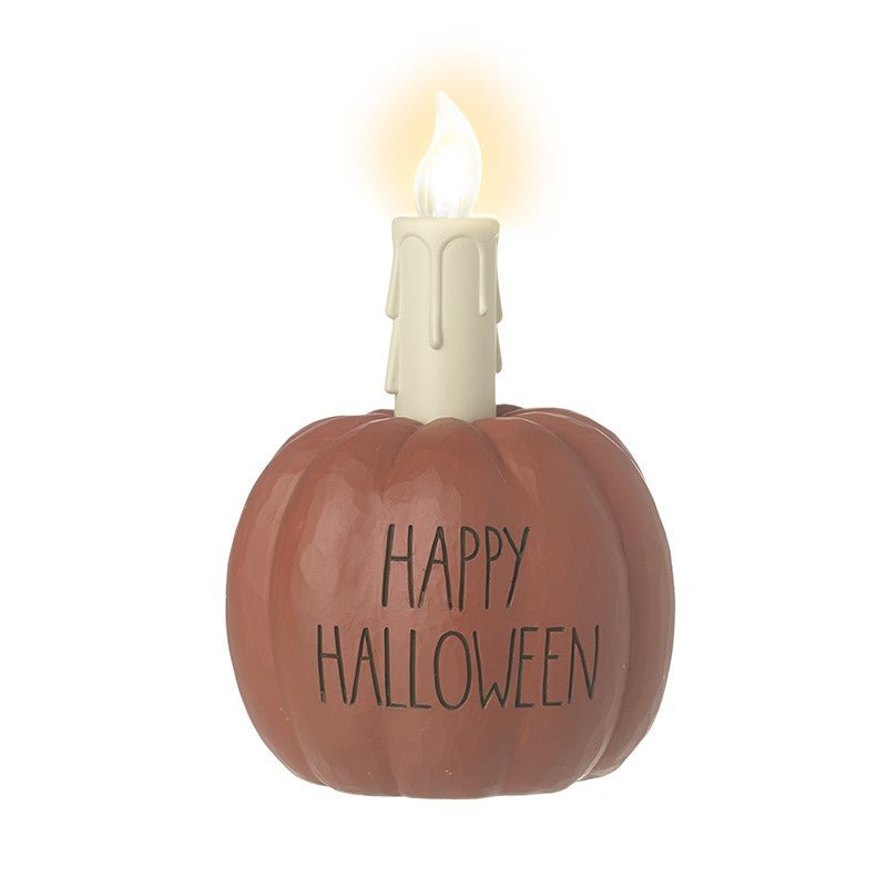 A cute pumpkin with the message 'Happy Halloween' and a battery-operated LED flameless candle at the top.