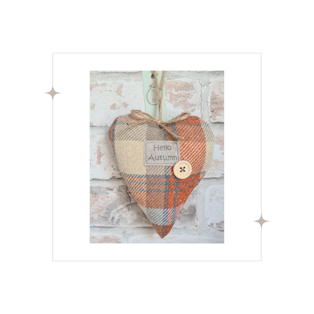 A cosy heart decoration for fall in our popular orange tartan fabric. The wording, which says Hello Autumn is printed onto a cream linen look fabric which is also used as the backing on the reverse side. Finished with a wooden button, jute twine hanger and bow and filled with premium hollow fibre.