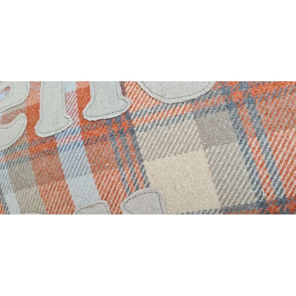 A beautiful fall cushion in our popular orange tartan fabric with Hello Fall hand drawn, hand cut and then free motion embroidered onto the front in a lovely cream linen look fabric. The reverse side of the cushion is an envelope fold back, in the same fabric as the lettering. Finished with a wooden button.