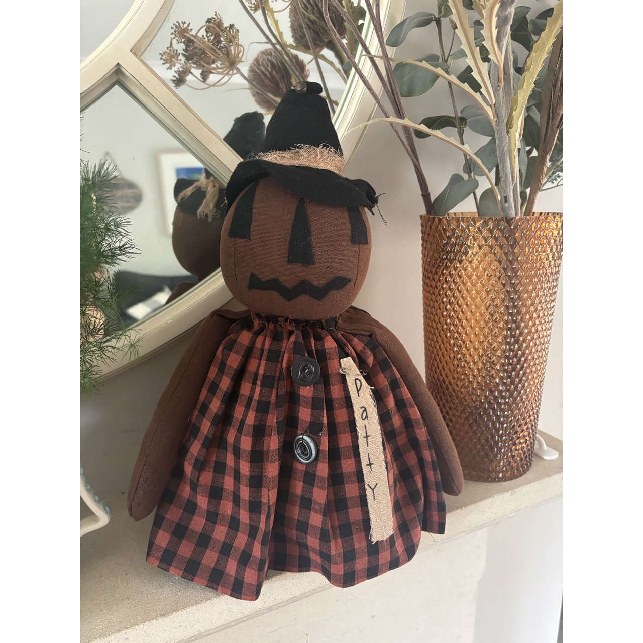 Our primitive Patty doll has a pumpkin head and wears a reddish orange check dress with a witch hat. This stuffed fabric doll is freestanding and will add a bit of primitive style to a country farmhouse fall or Halloween display.