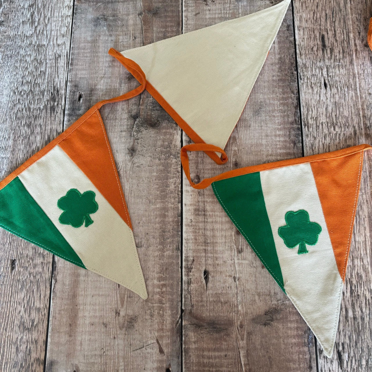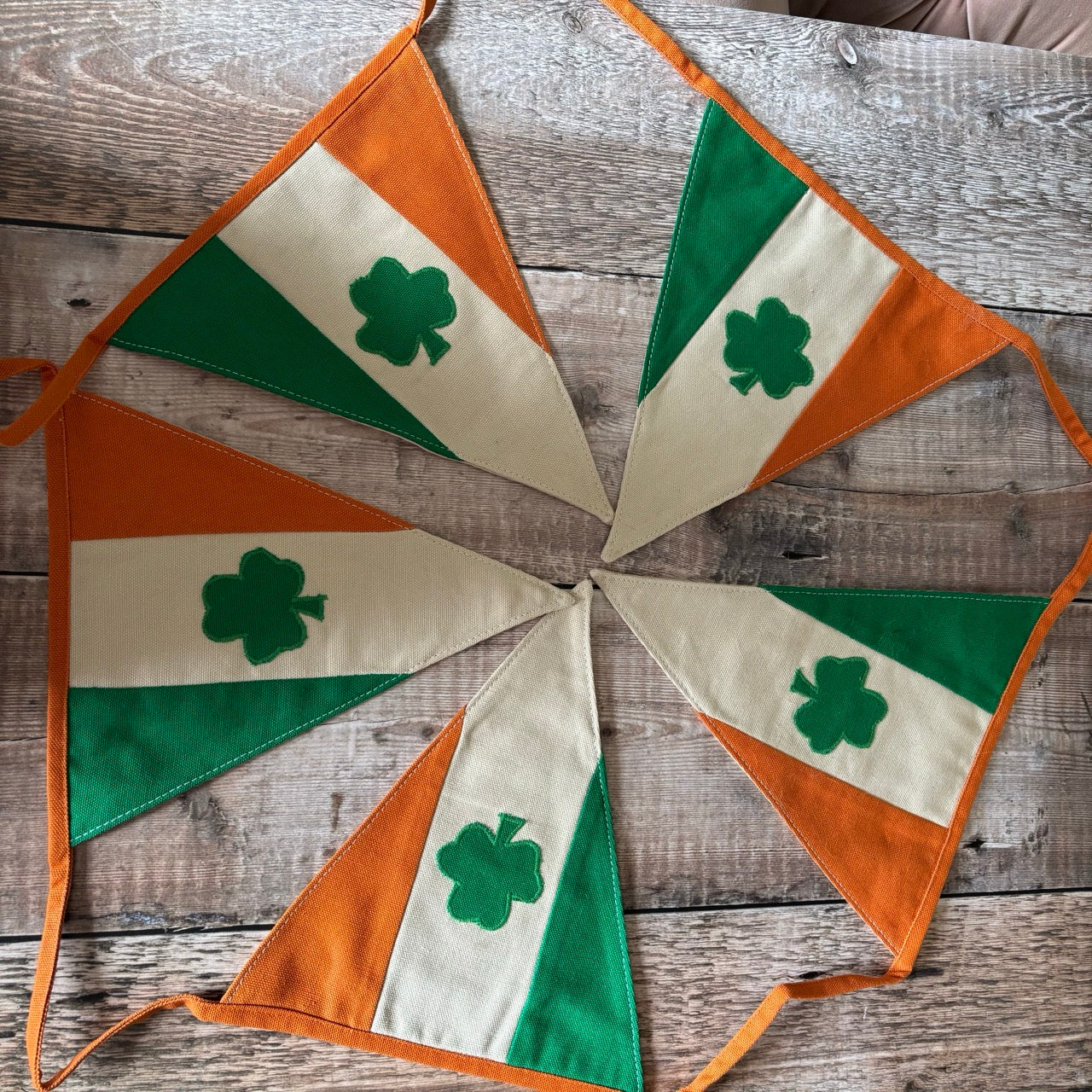 Our Irish shamrock bunting features nine vintage style flag pennants in green, orange and off white. Made from heavyweight sturdy 100% cotton with the reverse sides of the flags in solid off white fabric.