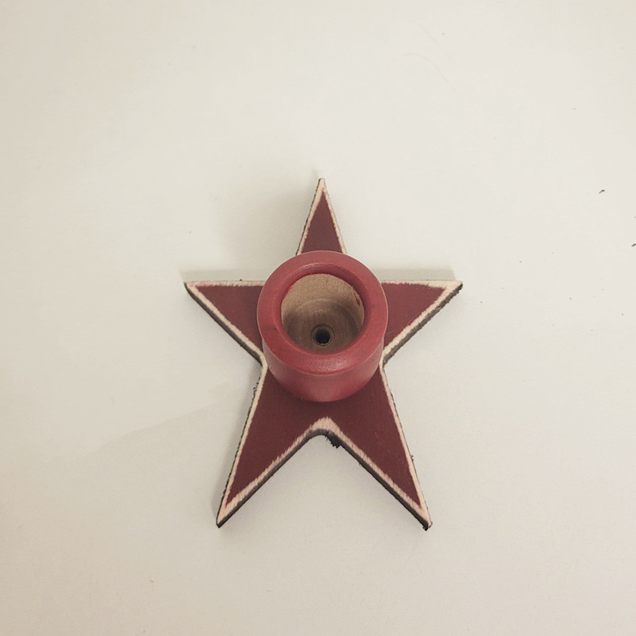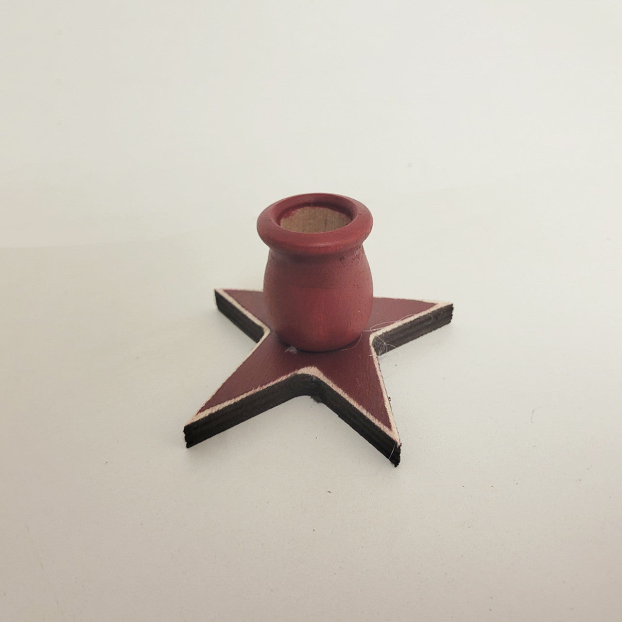 Wooden star-shaped candle holders painted in a warm barn red colour. Holders fit some of our timer taper candles with a narrowed edge base for a rustic American country look.