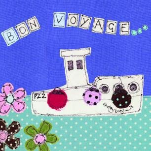 Pretty patchwork card with a boat and the message 'Bon Voyage' by designer Poppy Treffry...