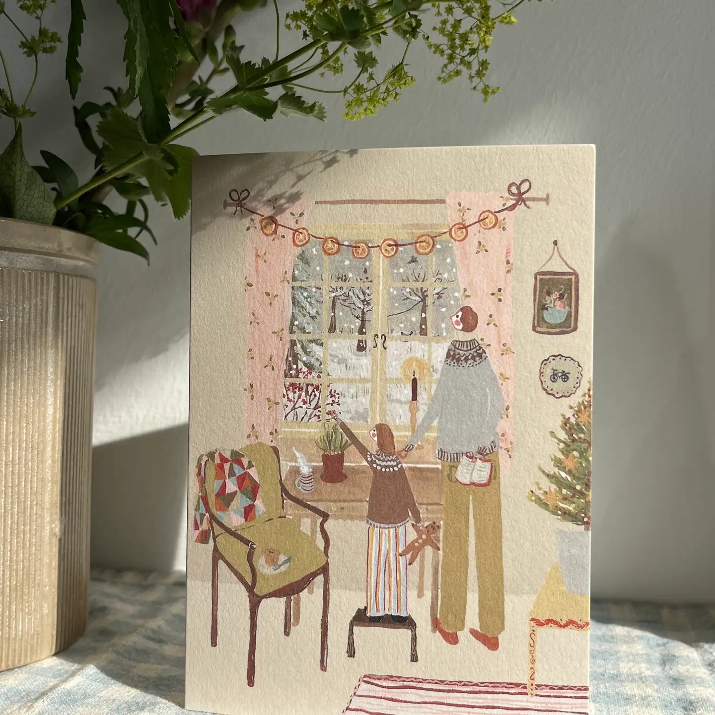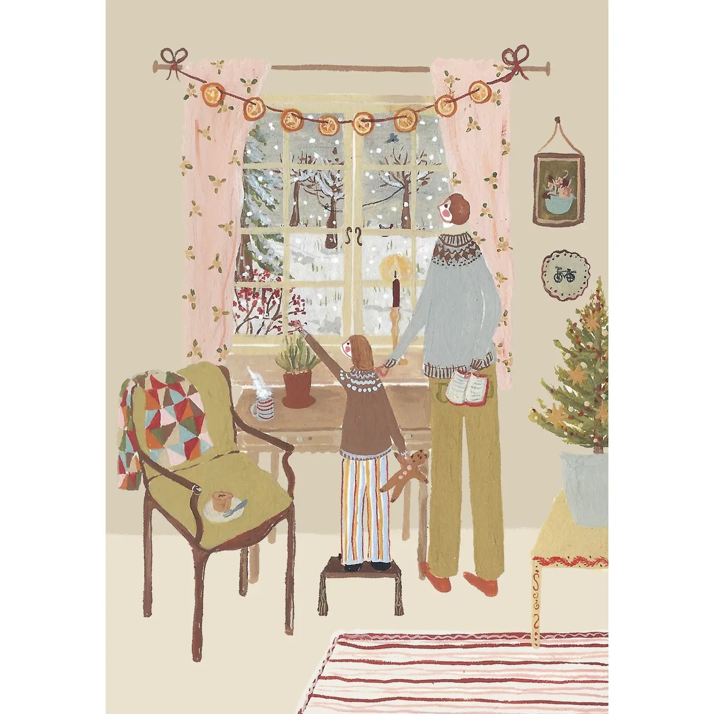 Another beautiful primitive folk art Christmas card complete with a patchwork quilt detail. Originally hand painted in rich gouache paint then printed to the highest quality on sustainably sourced tactile paper at 300gsm. Each greeting card is then paired with an 100% recycled cream envelope and a sticker clasp or a biodegradable sleeve.