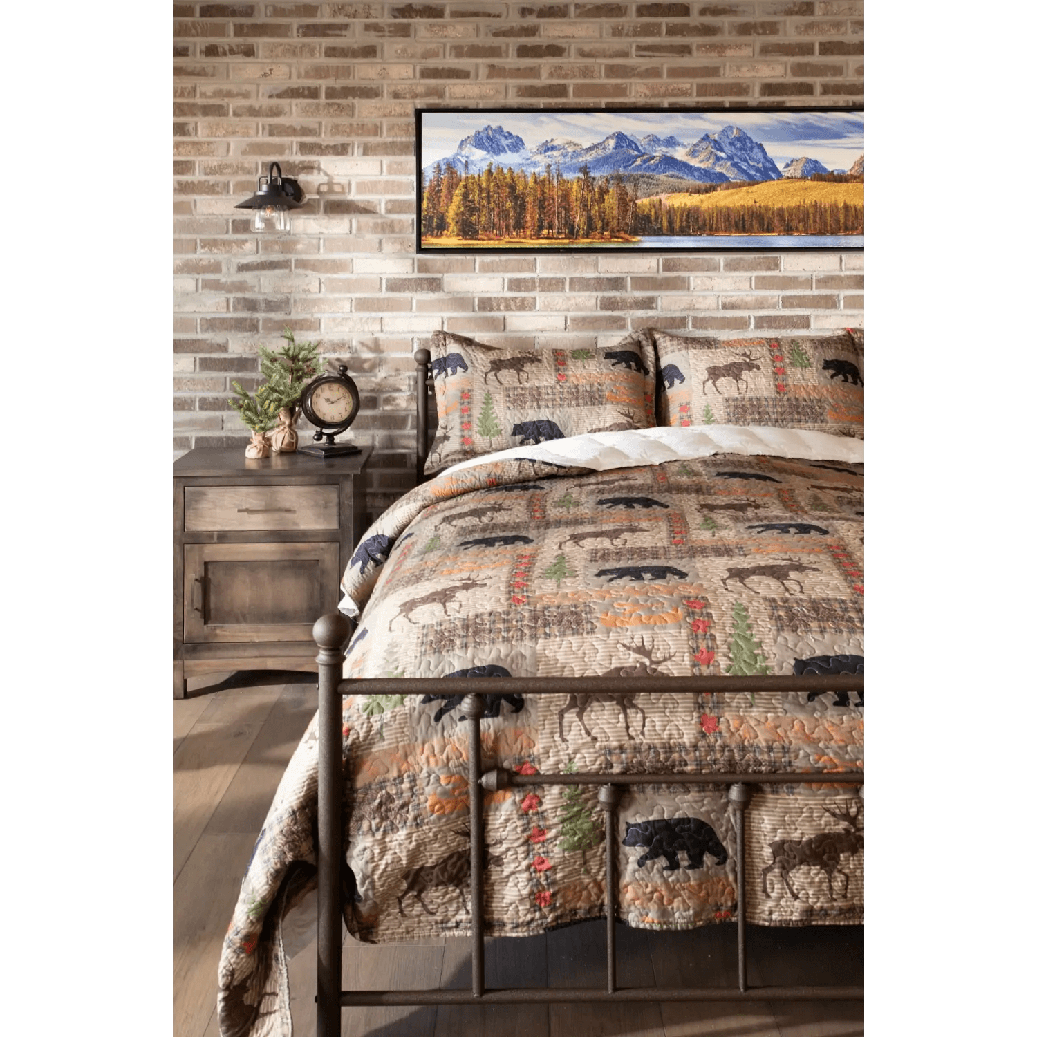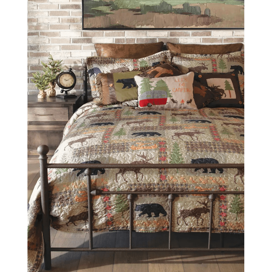An American farmhouse style quilt with a patchwork of pine green and black for a classic...