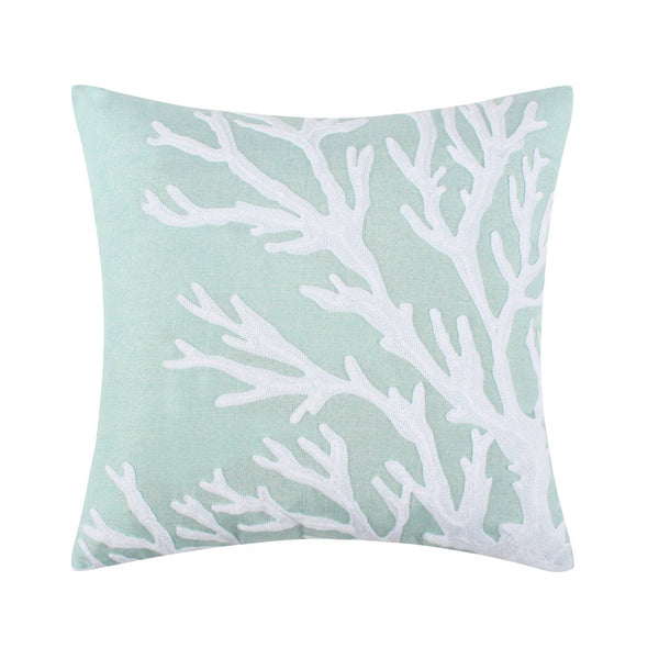 A beautiful cushion in a soft soothing colour featuring a crewel stitched coral in white...