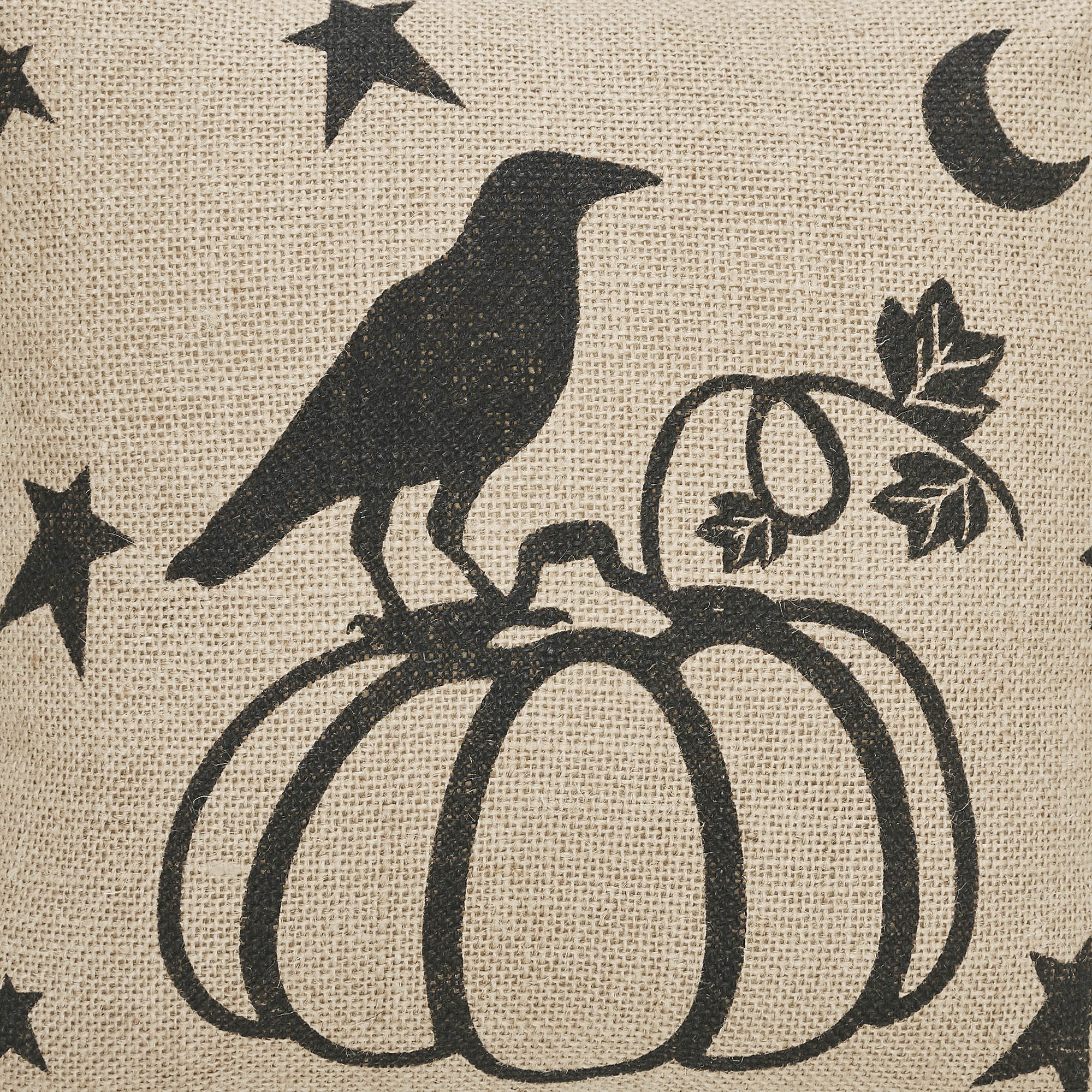 Add rustic autumn style to your home with texture-rich jute and a fun fall design. The cushion features a natural tan burlap with a black primitive folk art pumpkin and raven print, a sprinkling of five-point stars and a crescent moon.