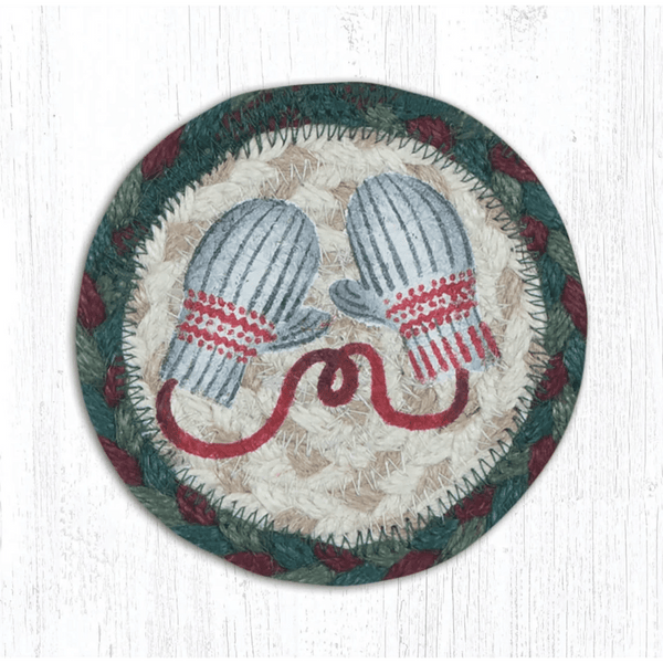 A braided table runner featuring an American barn decorated for Christmas in the snow and...