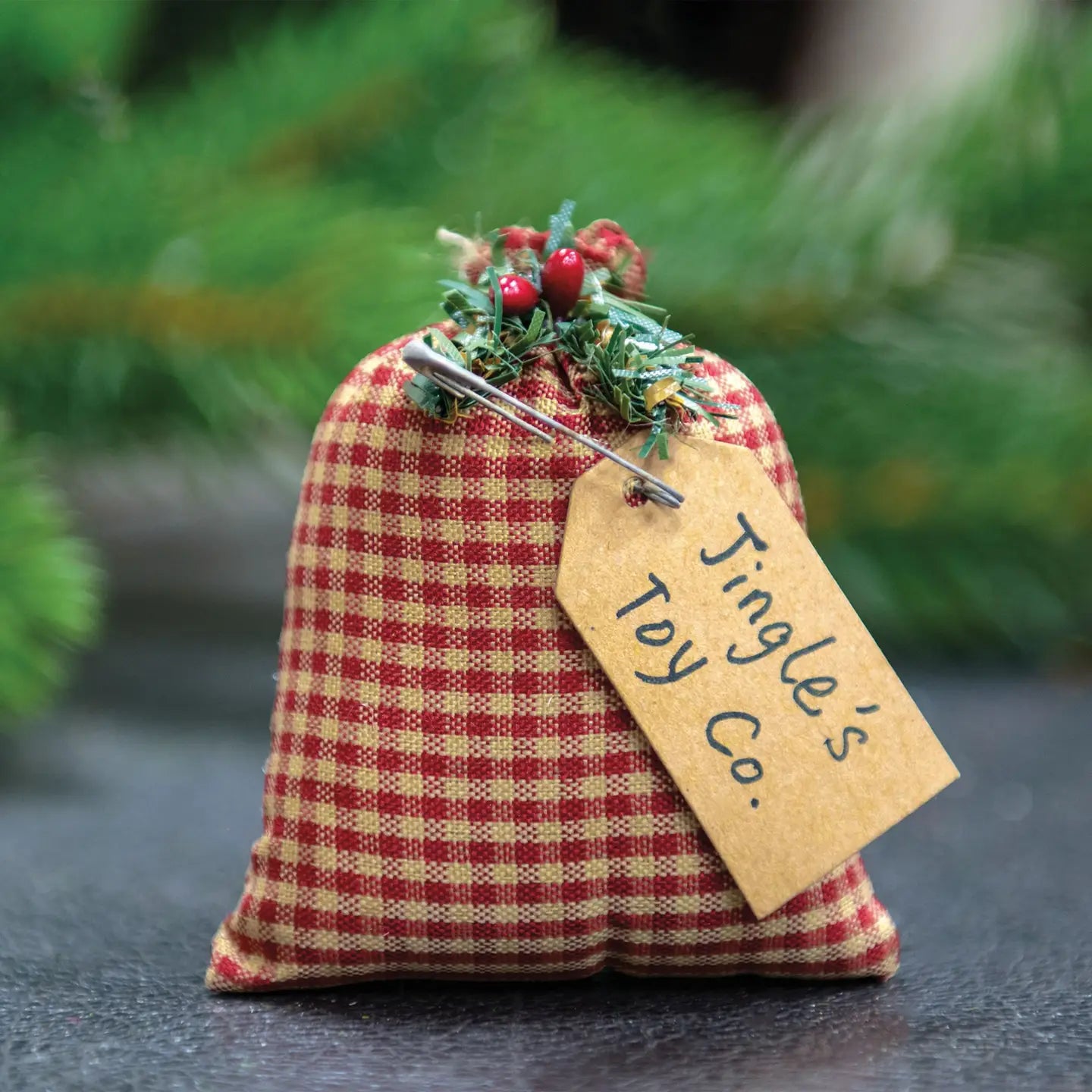 The Jingles Toy Company Bag Ornament is a stuffed fabric ornament perfect for accenting your favourite Christmas looks. It boasts a lovely red and tan buffalo check pattern with a pine and pip berry spray attached at the top. It has a price tag attached by a removable pin and reads, “Jingle’s Toy Co.” This ornament looks darling on a tree or hung from a nail or knob.