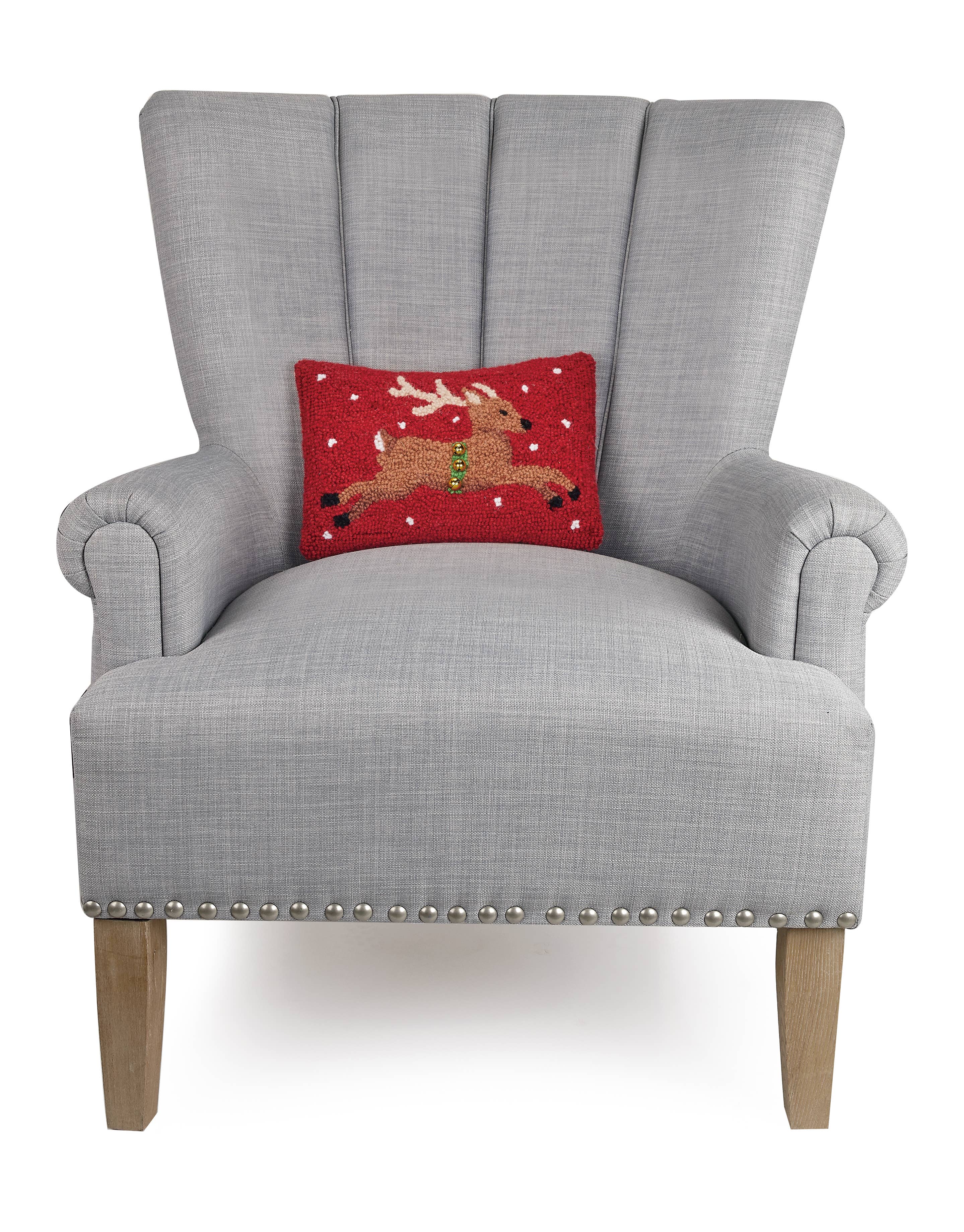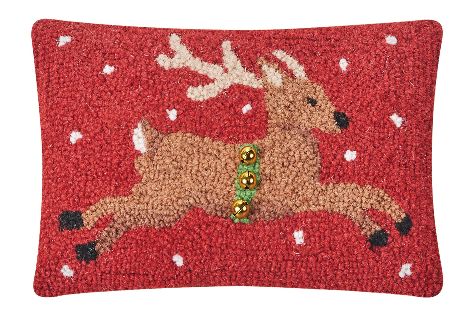 Such a cute little wool hooked accent pillow with a reindeer in flight wearing jingle bells surrounded by snowflakes set on a warm red background. Finished with an off white velvet backing. A festive way to spruce up your home for the holidays or would make a wonderful Christmas gift.