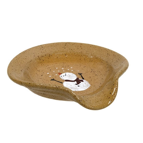 A functional and festive piece perfect for country Christmas kitchens. Crafted from ceramic, the spoon rest features a saucer shape with a downturned lip meant for resting utensils. The spoon rest features a beige finish with brown flecks and a smooth glazed. Painted design in the center of the spoon rest depicts a white snowman with black buttons and arms, a red scarf, an orange carrot nose, and a black dot smile. The snowman is shown looking, with white dots placed above him to mimic the look of snow.
