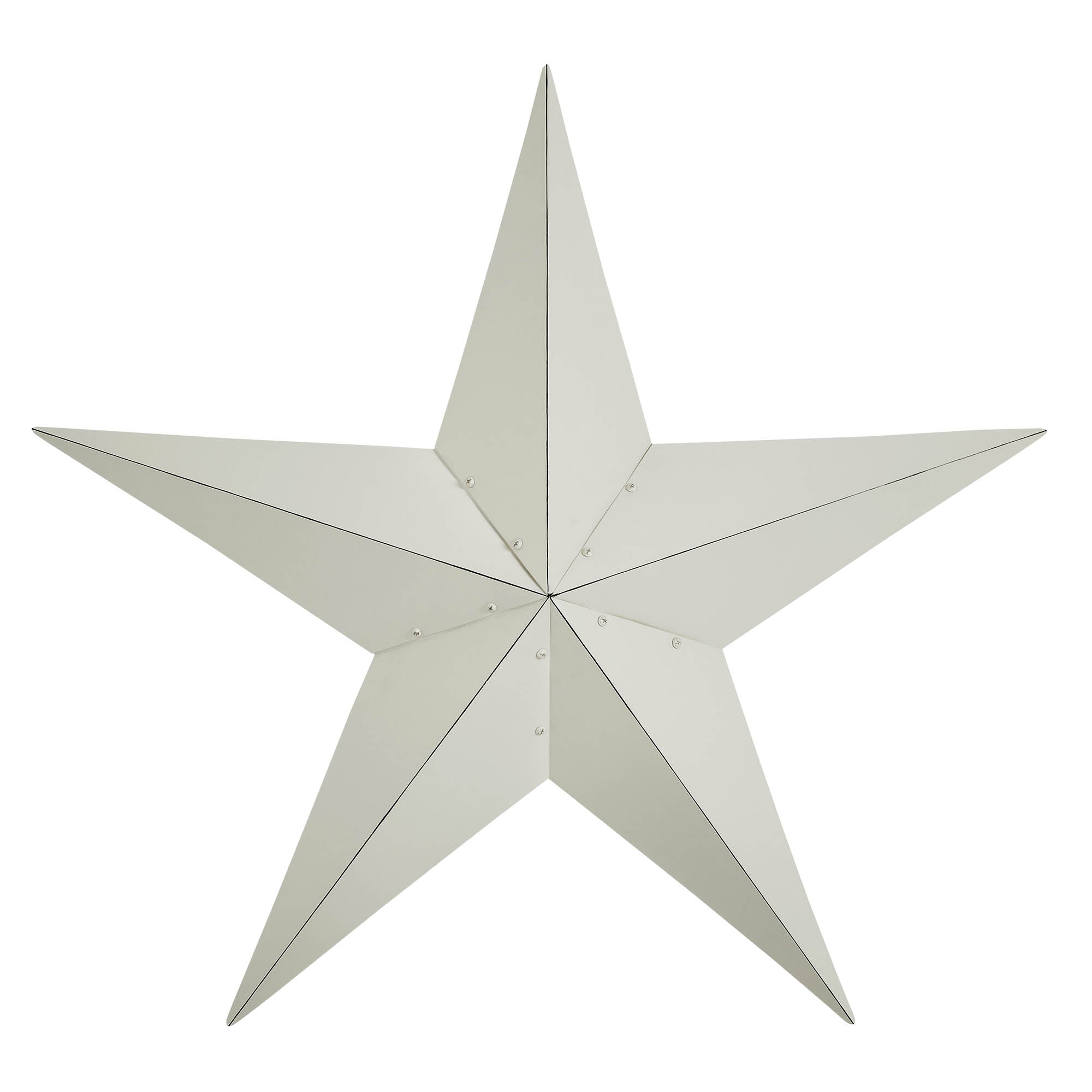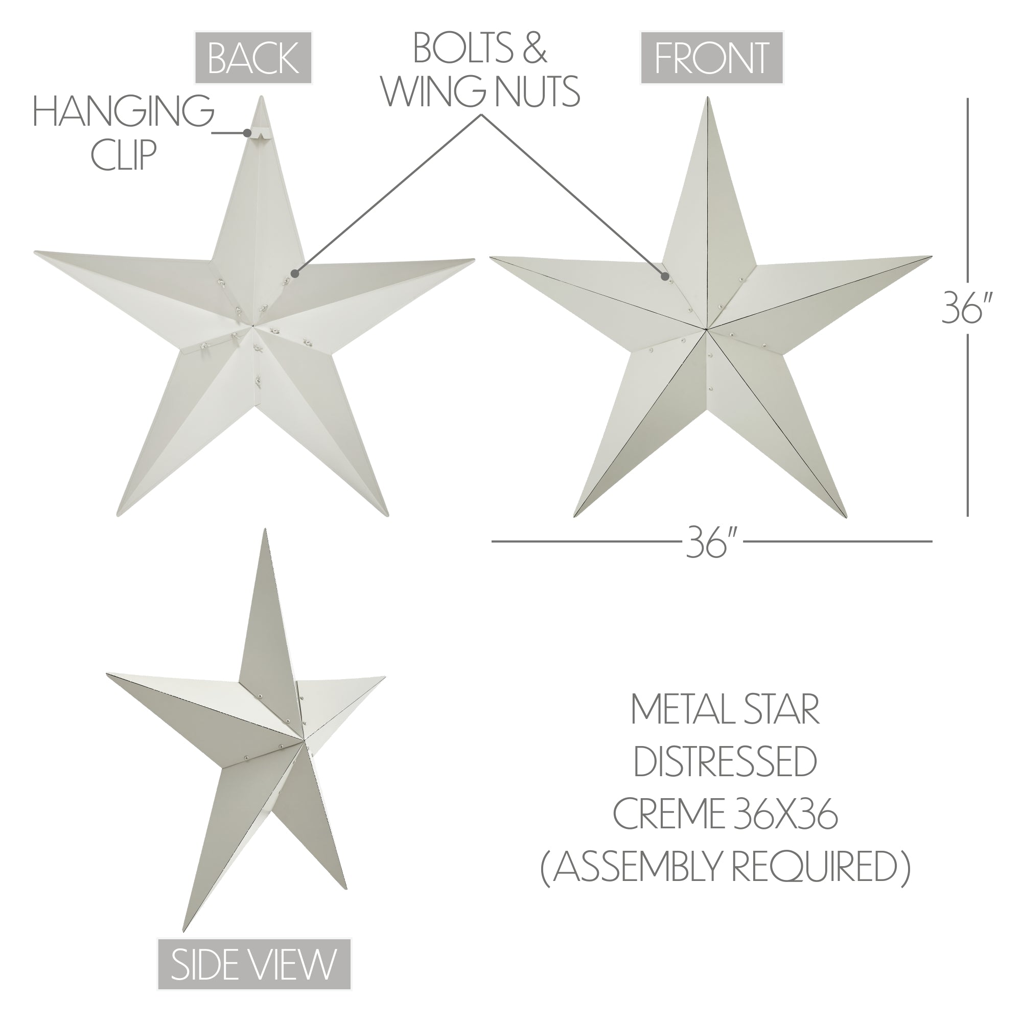 A bold statement piece, this large decorative wall hanging exudes rustic elegance and timeless charm. This oversized faceted five-point star is crafted from durable metal and finished in a soft cream hue with black distressing along the ridges creating a beautifully weathered, vintage-inspired look. Its grand size and striking design make it a standout piece, while the convenient hanging clip on the back ensures easy placement.
