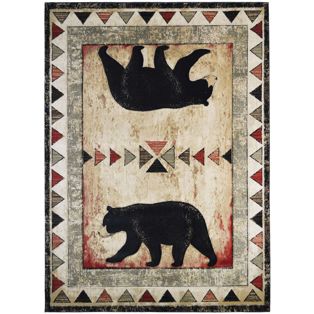 American log cabin style rug with eye catching bears in the centre. Unique rustic southwestern designs and luxury hand carving are the hallmarks of this rug collection. Made from heat set yarn with half million point constructions, this rug has a premium textured lodge/rustic look.