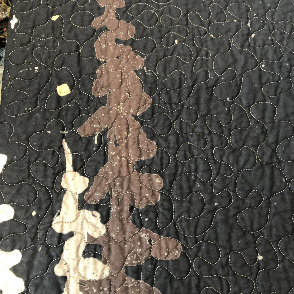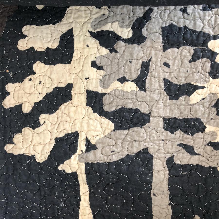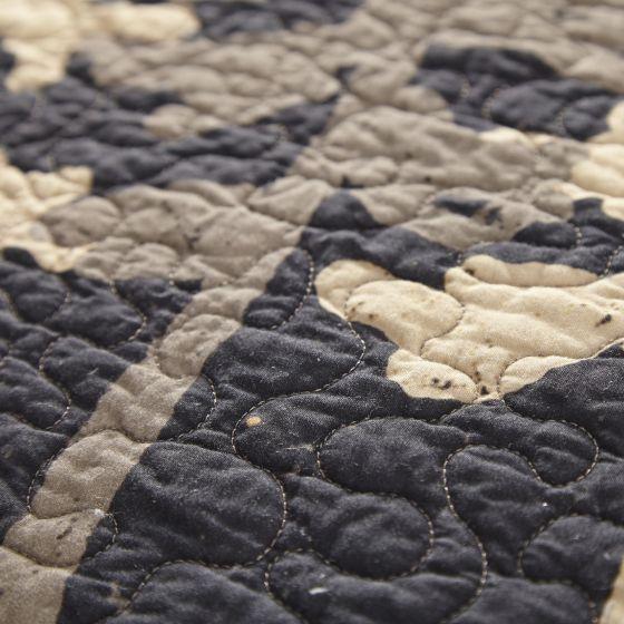 Quilt featuring a little log cabin nestled in a pine forest under a moonlit, starry night. Deep charcoal, shades of slate gray, khaki and soft mustard gold add a gentle outdoor touch to your decor. Coordinating pillow shams and cushions also available to order separately.