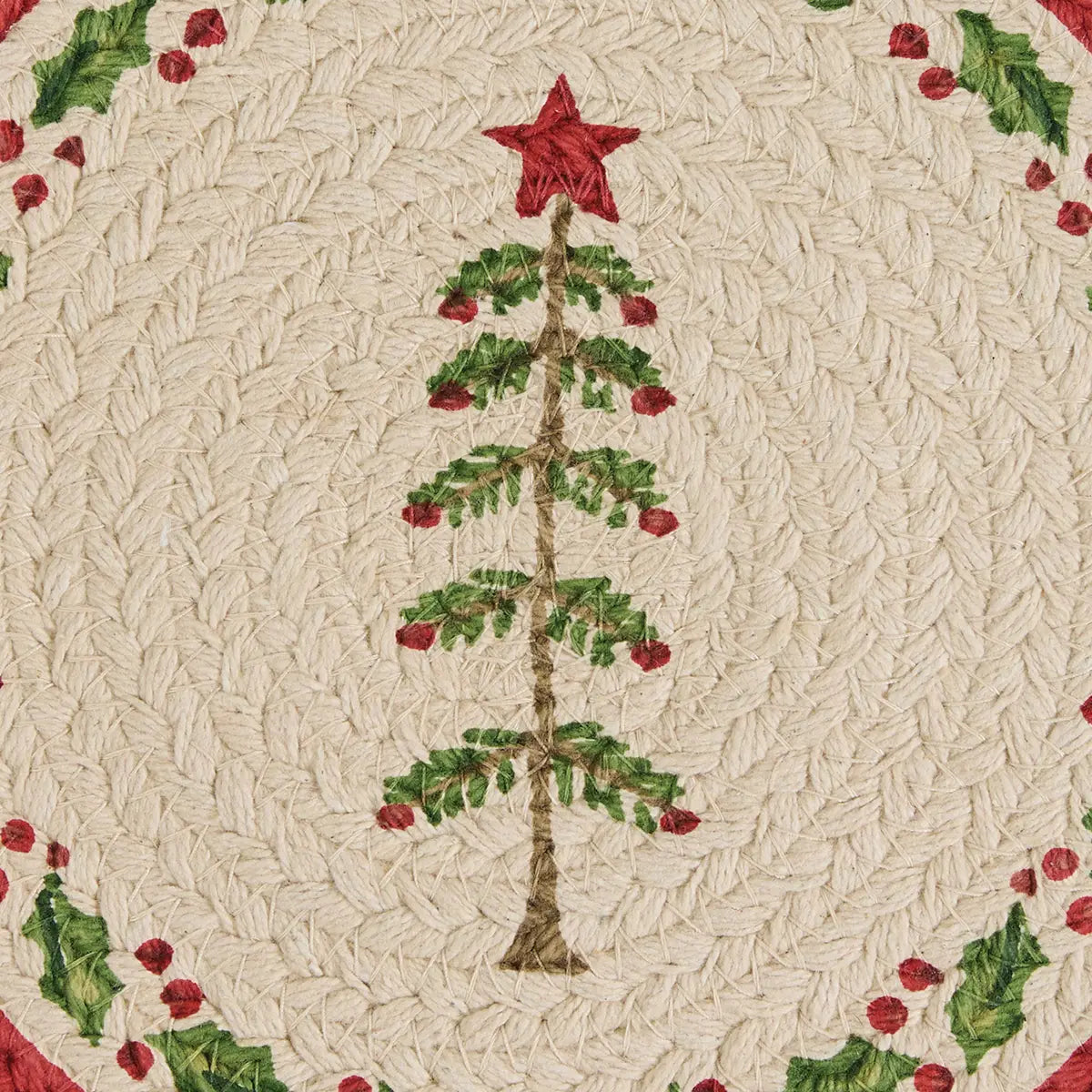 A New England style braided small trivet mat featuring a primitive feather tree with a star at the top and holly and berries along the border. Use to protect tables from hot drinks or serving plates or as a placemat.