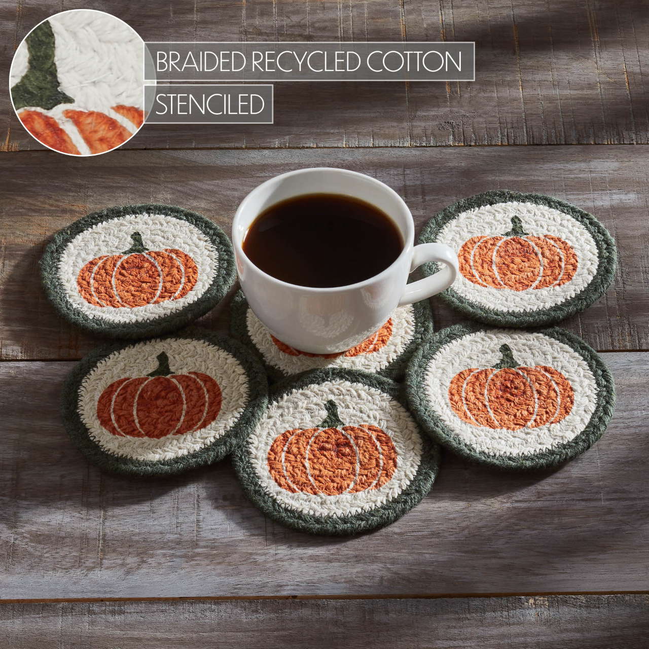 Add a touch of autumn charm to your fall and Halloween table decor. Crafted from a durable cotton-polyester blend, these coasters offer both functionality and style for your dining room or kitchen. Each coaster features a charming stencil design of a harvest pumpkin in rich ivory, burnt orange, and cypress green hues, capturing the essence of the fall season with rustic elegance. Measuring in a round shape, these coasters provide ample space for your drinkware while protecting your tabletops from water rings and spills. Their graphic print and stenciled motif add a festive touch to your fall gatherings, making them perfect for use during Thanksgiving feasts and Halloween parties.
