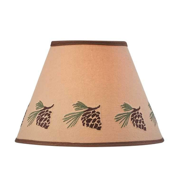 Tan lampshade with cocoa brown trim along the edges and decorated with embroidered pinecones in...