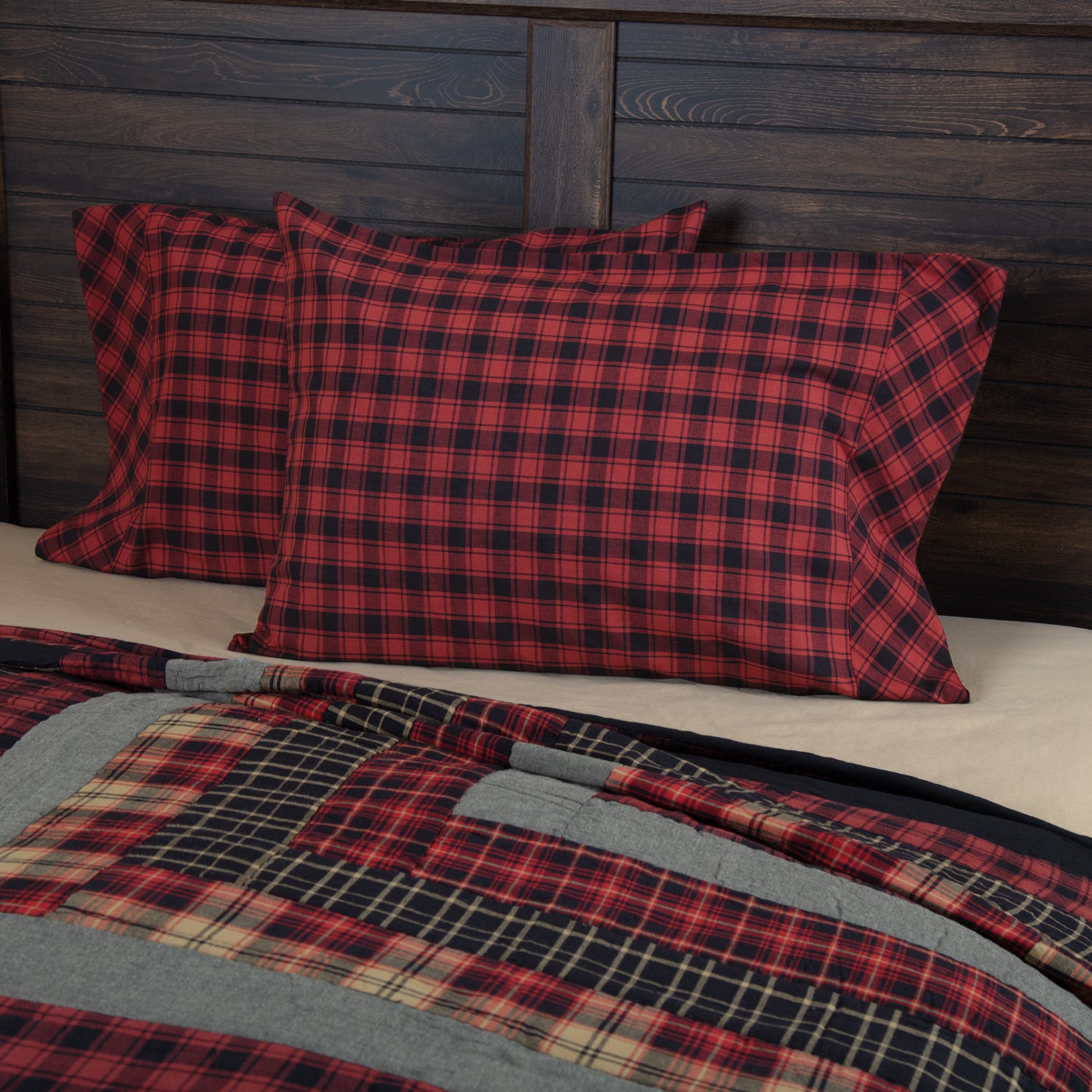 Quilted pillowcase with a log cabin patchwork of red, black, grey and tan check fabrics....