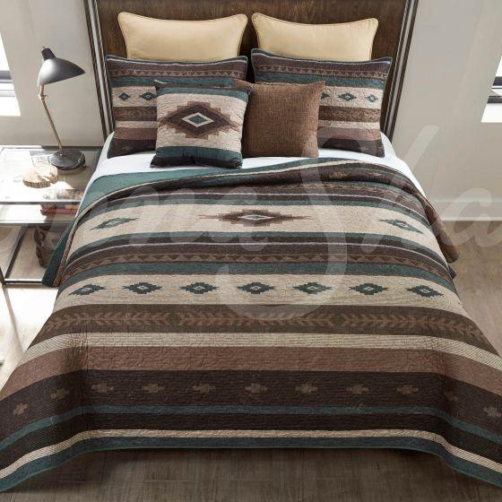 Quilted 3-piece reversible bedding set featuring a series of outdoor motifs, check and geometric elements...