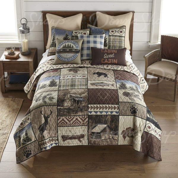 This eye-catching, 3-piece quilted bedding collection features a cabin under the stars, surrounded by pine trees and forest animals. Colours include forest green, pale gold, black, burnt umber and cocoa brown. The brushed polyester fabric is easy care and super soft right out of the package.