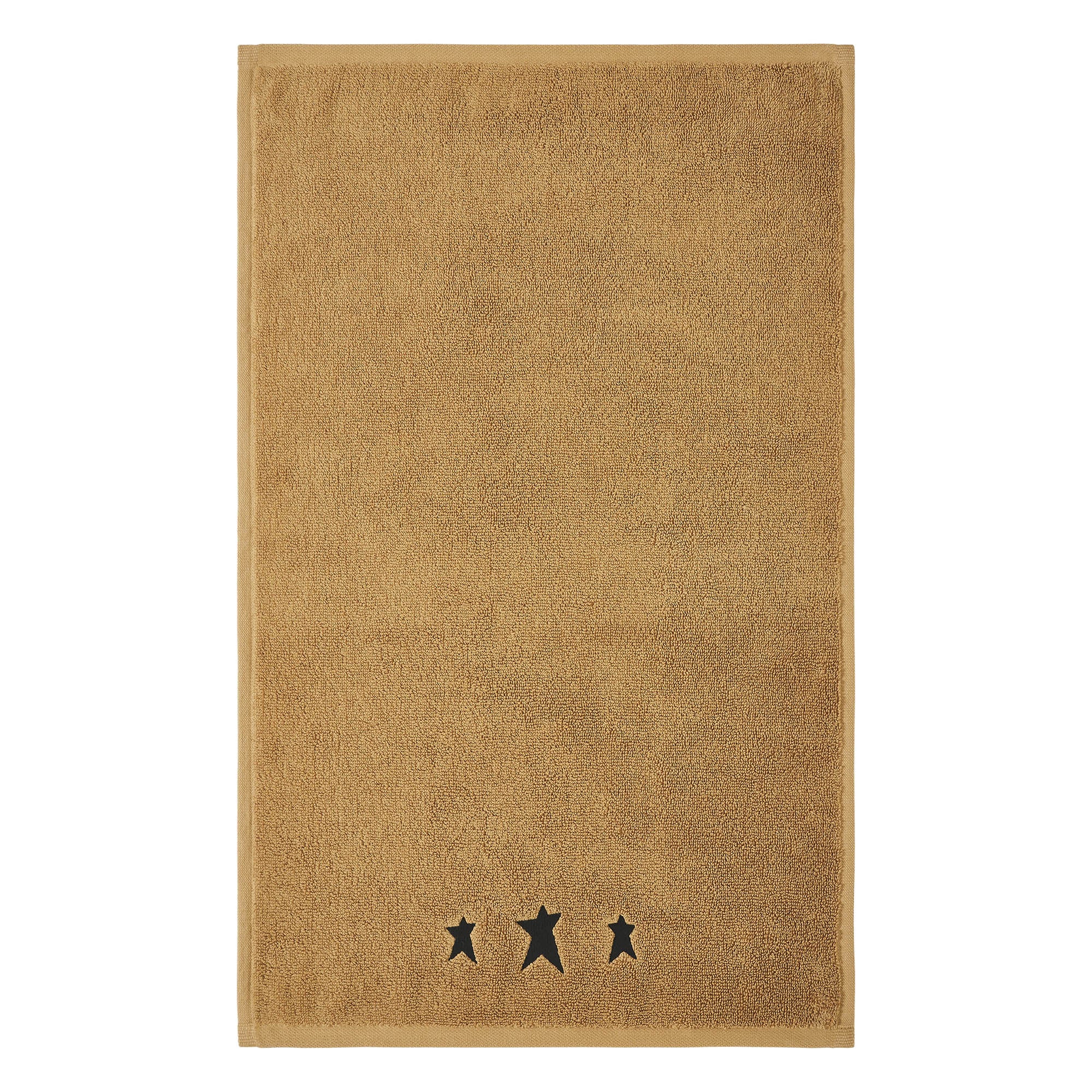 Enhance your bathroom with the rustic charm of the Black Primitive Stars Tan hand Towel. Crafted from soft and absorbent cotton terrycloth, this towel provides both comfort and functionality for everyday use. The neutral doe tan hue offers a warm, inviting base, while the embroidered design at the bottom showcases three primitive stars in a country black shade, adding a classic country-inspired touch. The primitive star design in black enhances the rustic and farmhouse feel of any bathroom.
