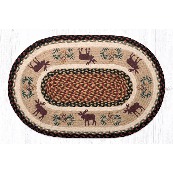 Rustic lodge style rug with a moose and cedar trees stencil design and the message...