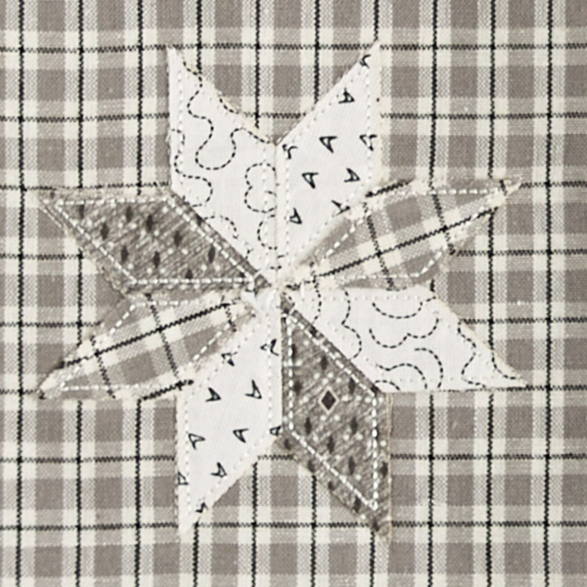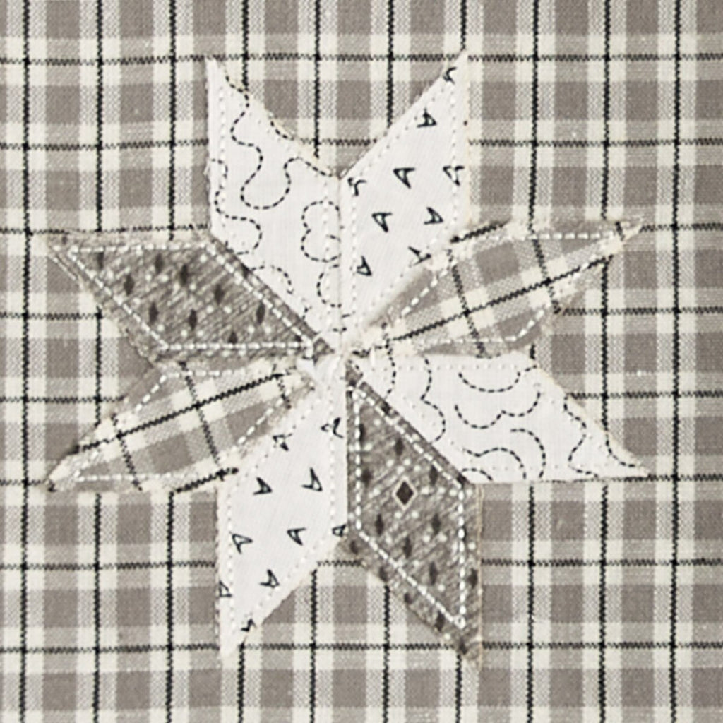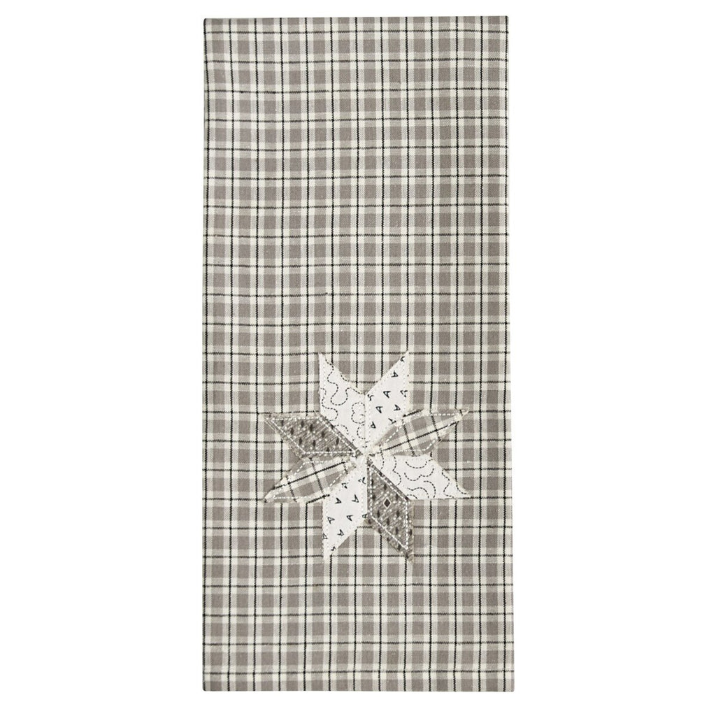 An American farmhouse style towel in neutral grey check with a broken star appliqué detail.