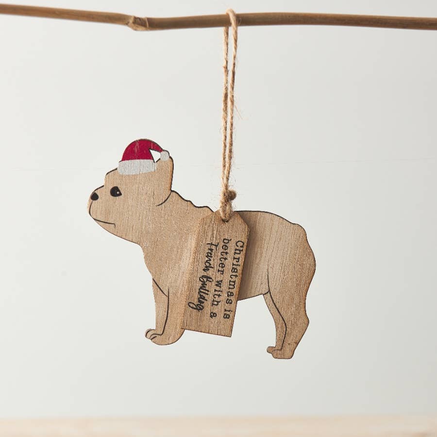 A silhouette ornament of a French Bulldog wearing a red Christmas hat. It features a small tag with 'Christmas is better with a French Bulldog'. A great gift idea for anyone who loves the breed.