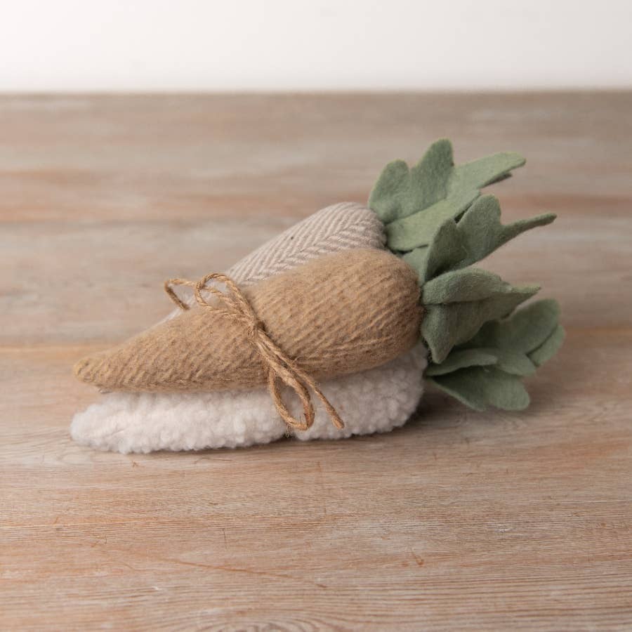 These country style fabric carrots in natural textured and patterned fabrics are perfect to create beautiful spring and Easter displays and table settings.