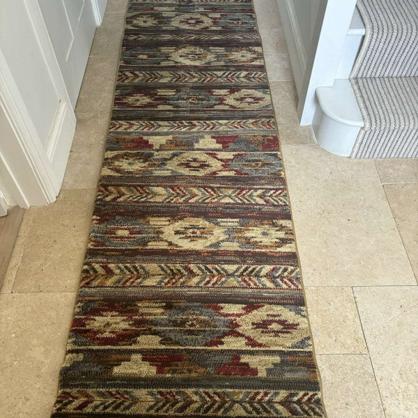 A classic American designed log cabin style floor runner rug in earthy browns and tans...