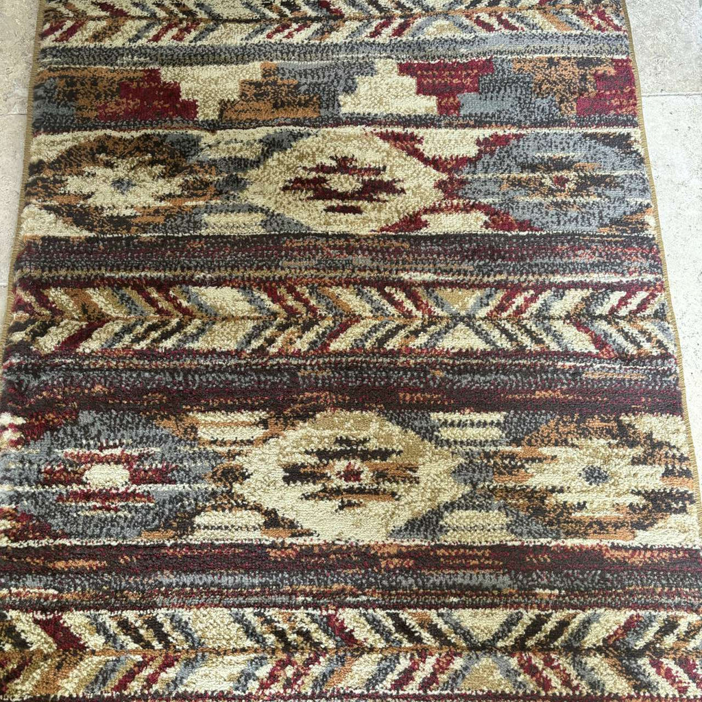A beautiful American Southwestern style rug in warm earthy shades with golds, beige, brown, brick red and a touch of grey. A stylish design that works well with many room styles and colours.