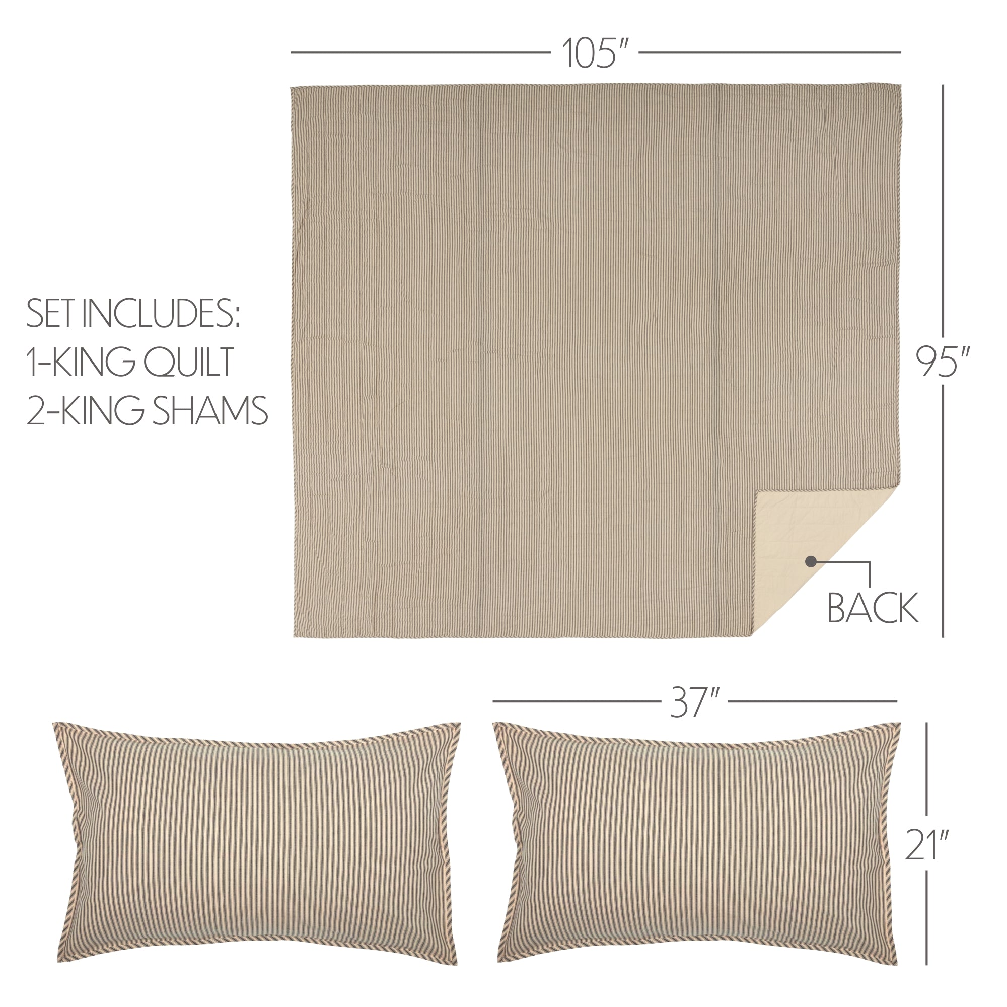 Add a modern farmhouse style to your bedroom decor with vintage ticking stripes in muted, neutral tones. The Sawyer Mill Charcoal Ticking Stripe 3 piece quilt set includes one quilt and two 2 quilted pillow shams. The country farmhouse bedding set features a solid ticking stripe in dark cream and charcoal black.