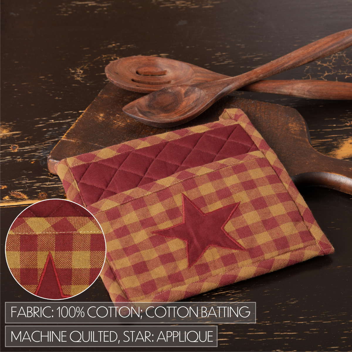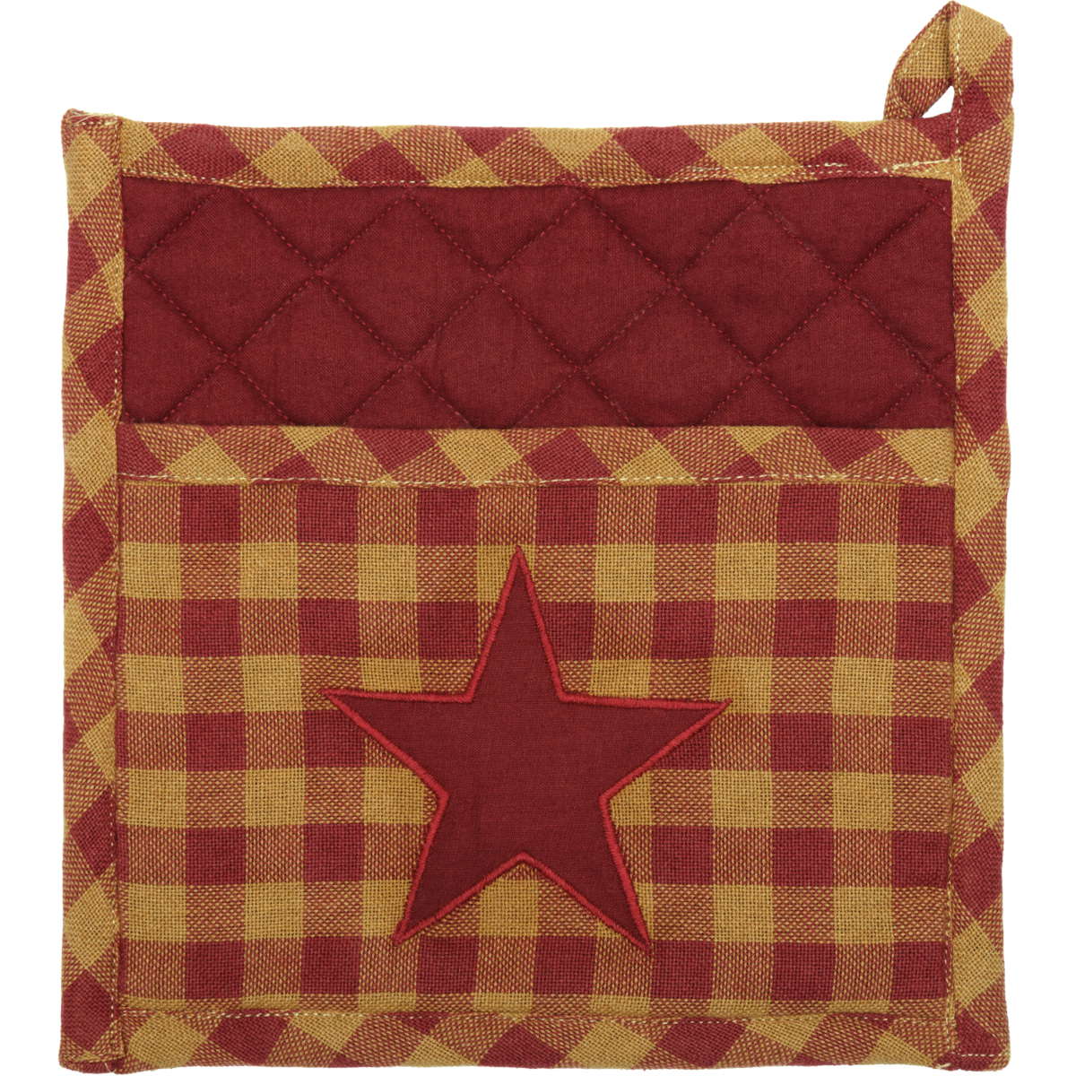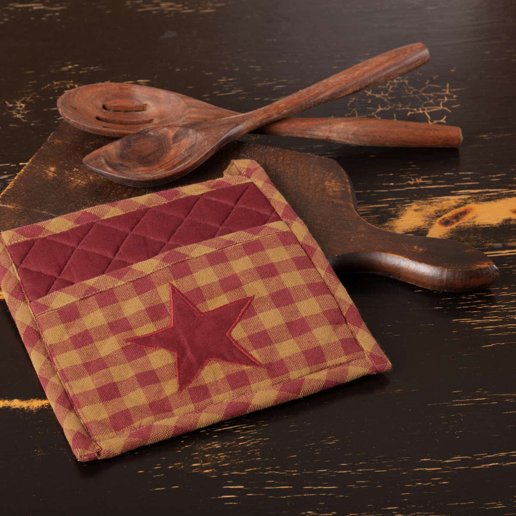 Protect your hands from hot pots and steaming pans with an American primitive country design. An eight inch square pot holder in a dark tan and burgundy red checkered plaid. The top of the classic quilted pattern includes an applique star accent in burgundy. The pot holder includes a 100 percent cotton shell with a thick cotton batting to protect your hands from burns. The stylish kitchen accessory is machine washable and can easily be stored with a 1-inch loop to hang within easy reach of your cooker or hob.