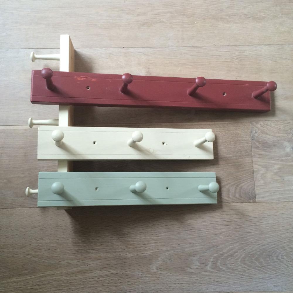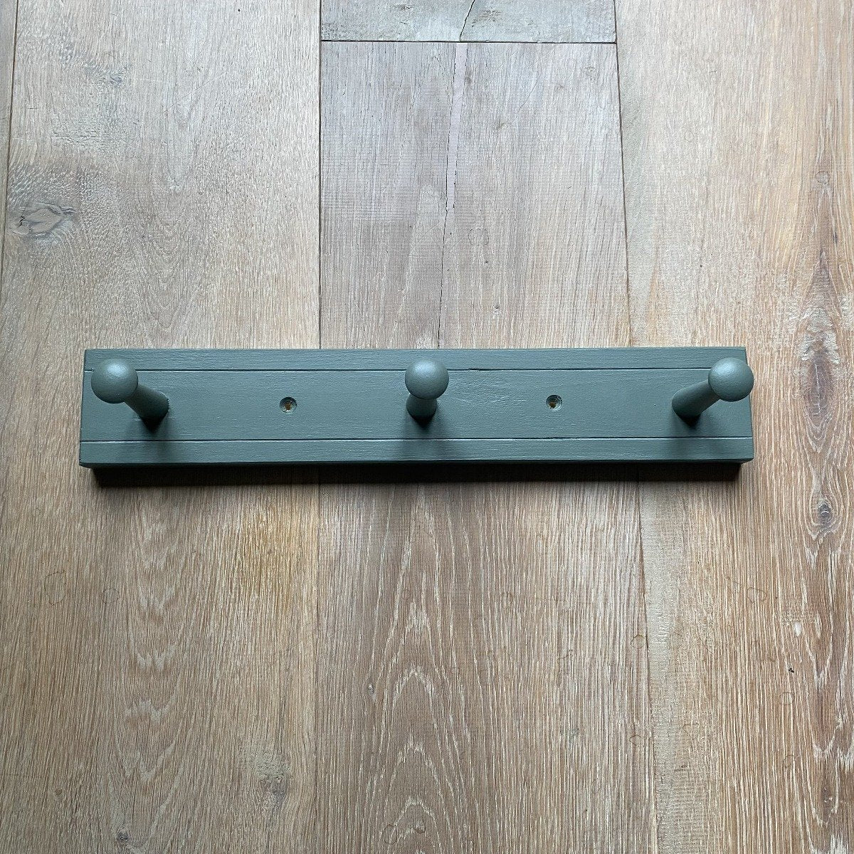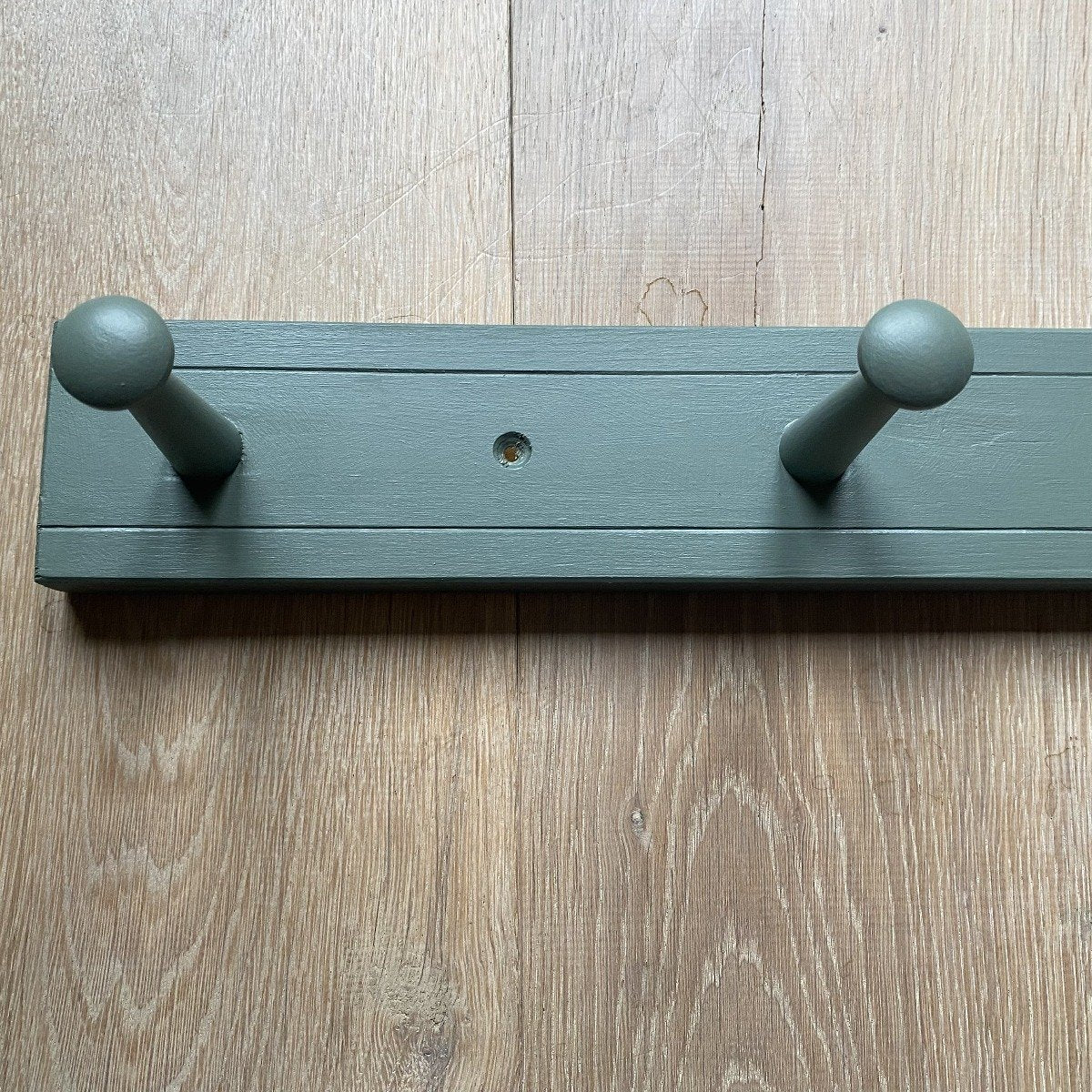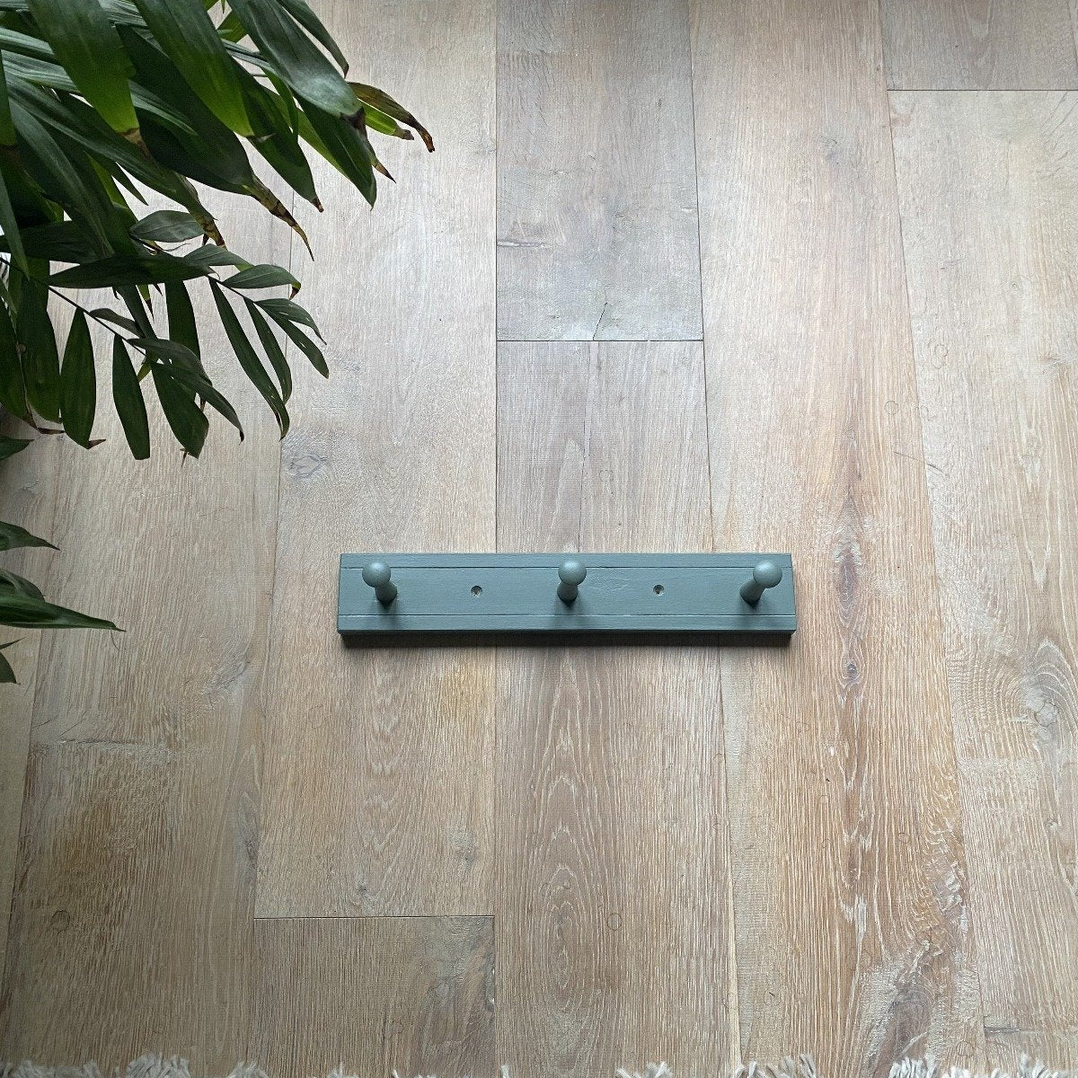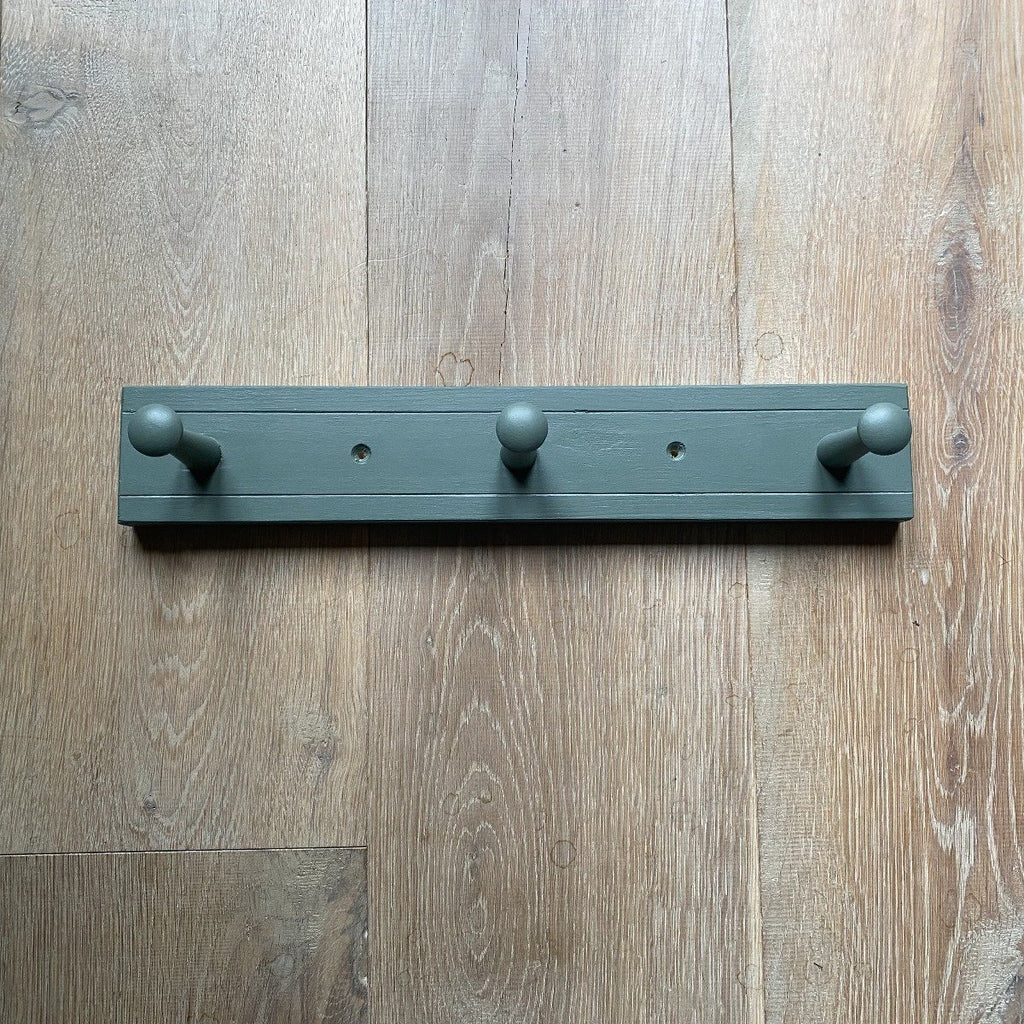 Handmade Shaker style pegrail painted in Green Smoke, a smoky green blue shade by Farrow & Ball. Pegracks are perfect for storing all sorts of items from jewellery, to tea towels, clothes, photo frames, bags etc.