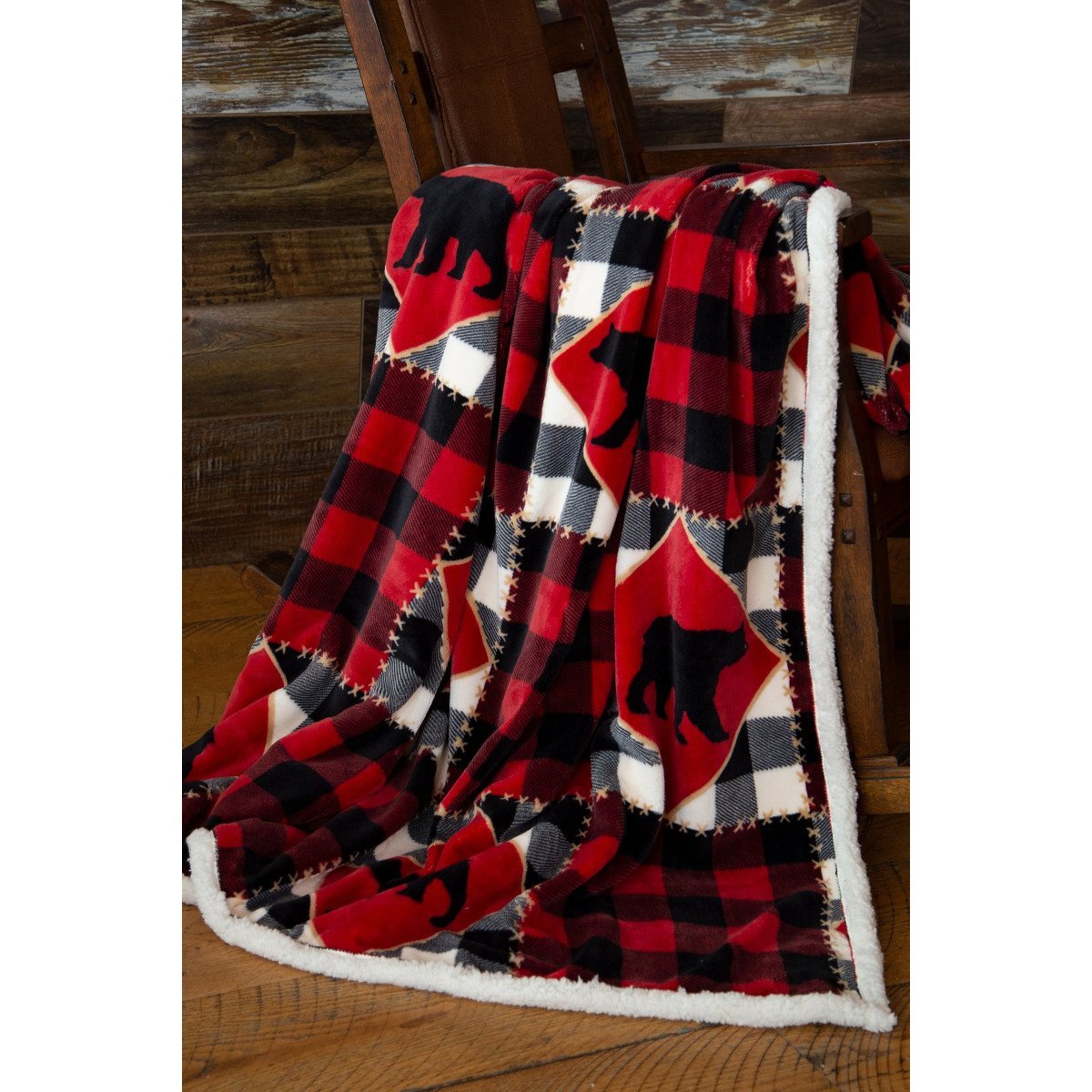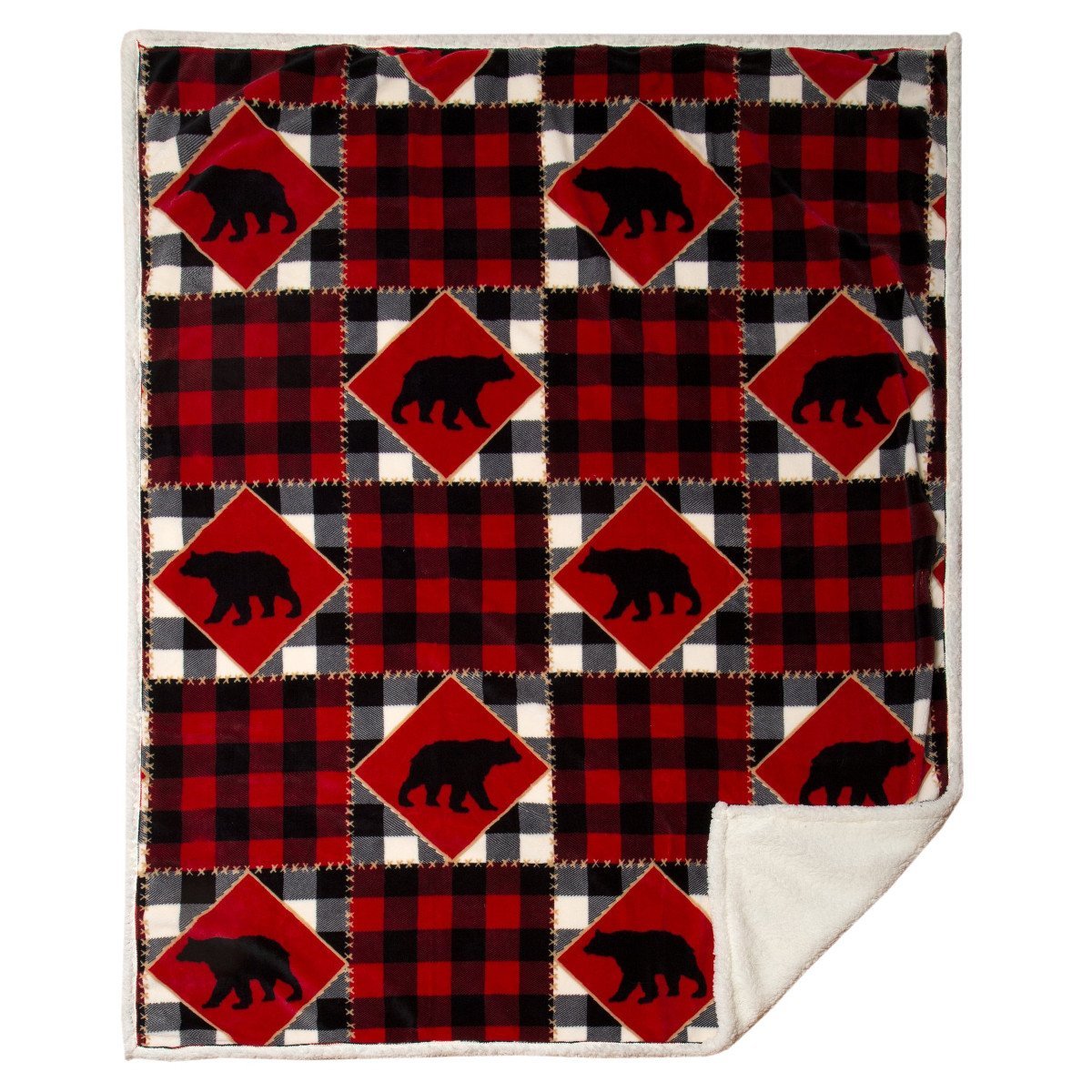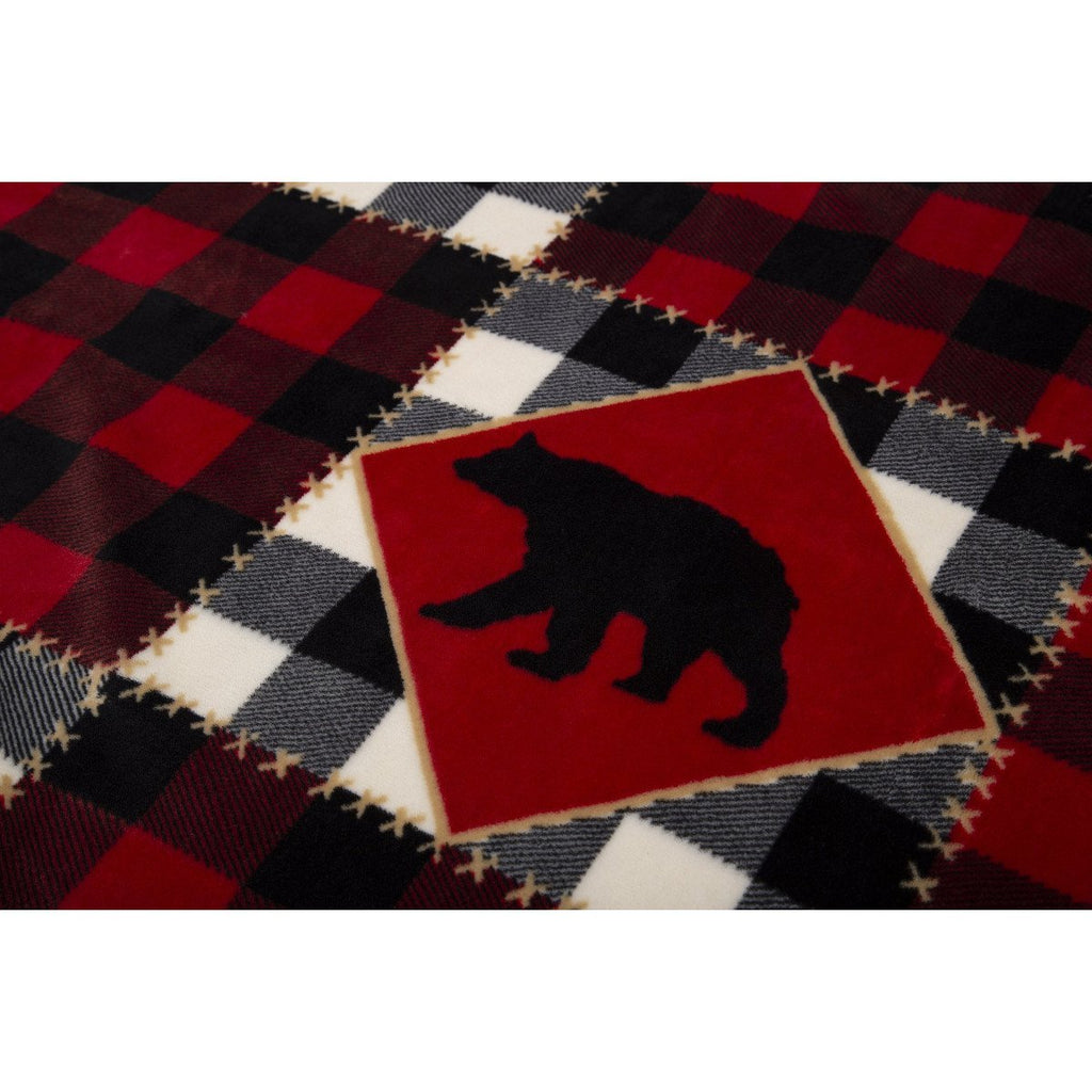 American lodge style super soft plush throw that is lined with a luxurious faux Shearling. Pattern is a classic red and black lumberjack check design accented with black bears. Throw is heavyweight and double the thickness of typical thin sherpa throws.