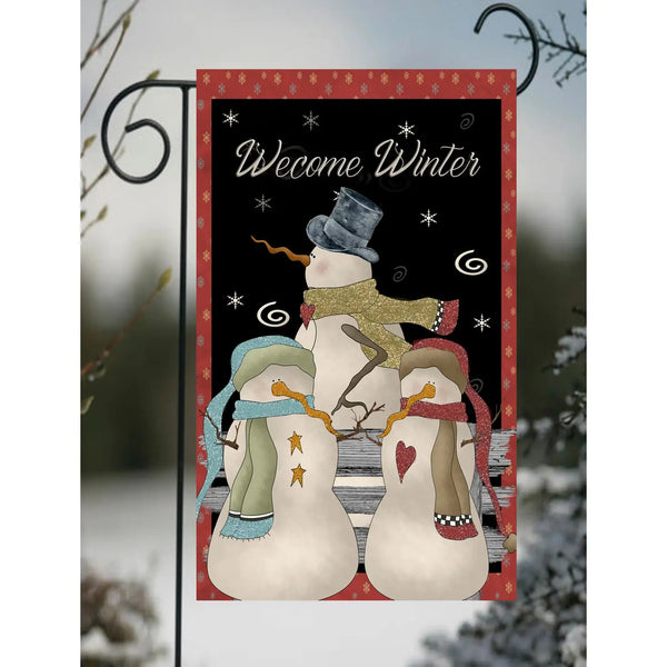 A fun flag to welcome visitors all winter long featuring a trio of snowman and...