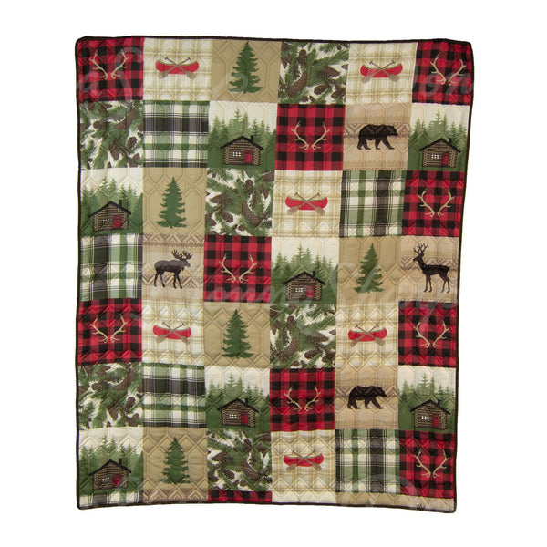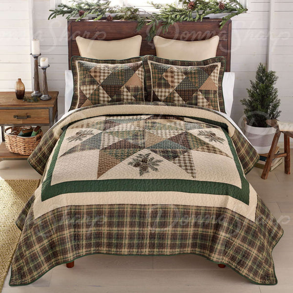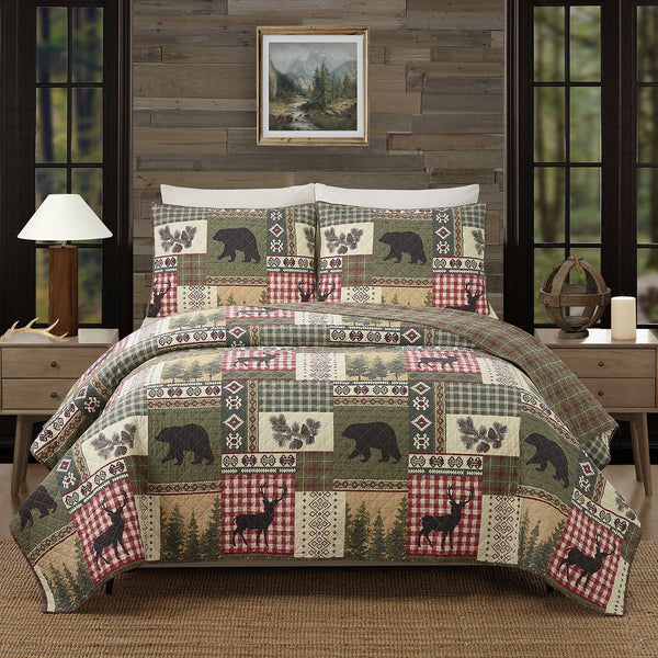 This eye-catching, 3-piece quilted bedding collection features a cabin under the stars, surrounded by pine...