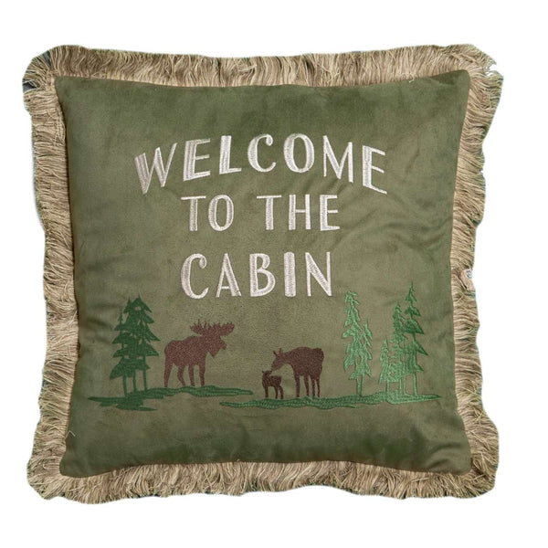 Rustic lodge style rug with a moose and cedar trees stencil design and the message...