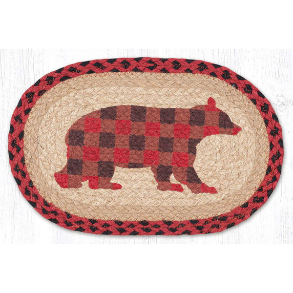 A hand stencilled jute braided mat with bear in a red buffalo check pattern. Perfect...