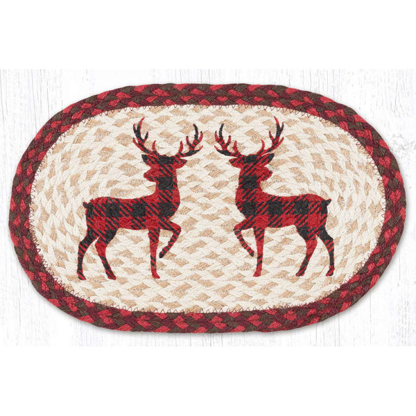 A hand stencilled jute braided mat with a pair of deer in a red buffalo...
