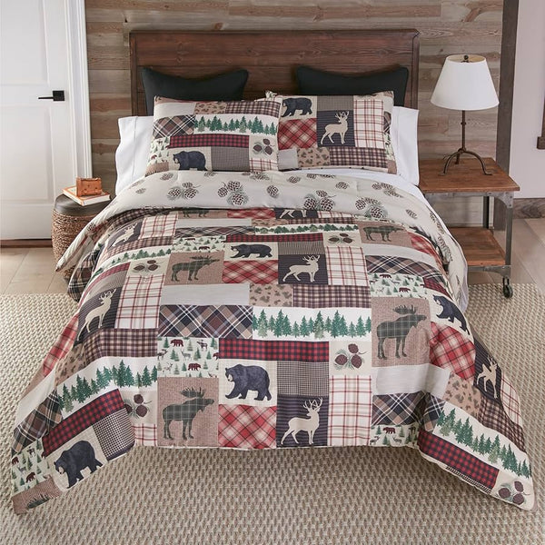 Quilted lightweight bedspread and pillow sham set in a colourful lodge design with bears, moose,...