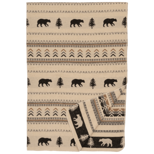 A large American designed rug featuring a black bear in the centre surrounded by a neutral check...