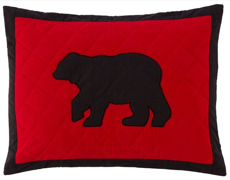 Quilted pillow sham with an appliqued black bear set on a red background surrounded by...