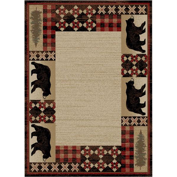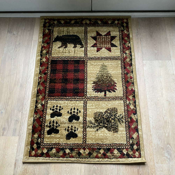 American log cabin style rug with a patchwork of motifs and bears in a blend of earthy tones...