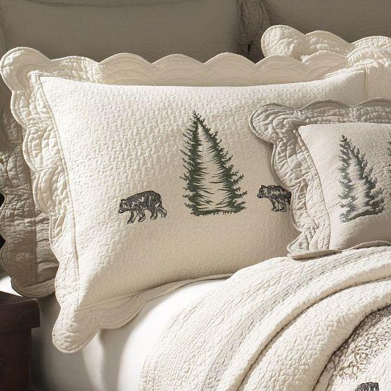 This subtle log cabin style quilt brings a touch of elegance to a rustic design. Black bears and trees are embroidered onto soft warm cream fabric, giving it a quiet sophistication. There is a greenish taupe framed square in the centre of the quilt. Finished with quilted scalloped edges and intricate stitching details. Coordinating pillow shams and cushion also available to order separately.
