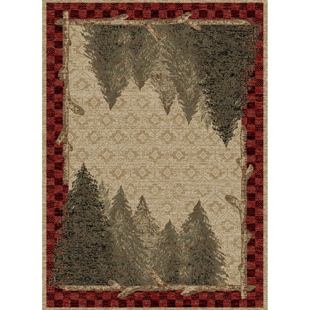Lodge style rug rug to a touch of American log cabin decor. In earthy browns and tan along with greens and red.