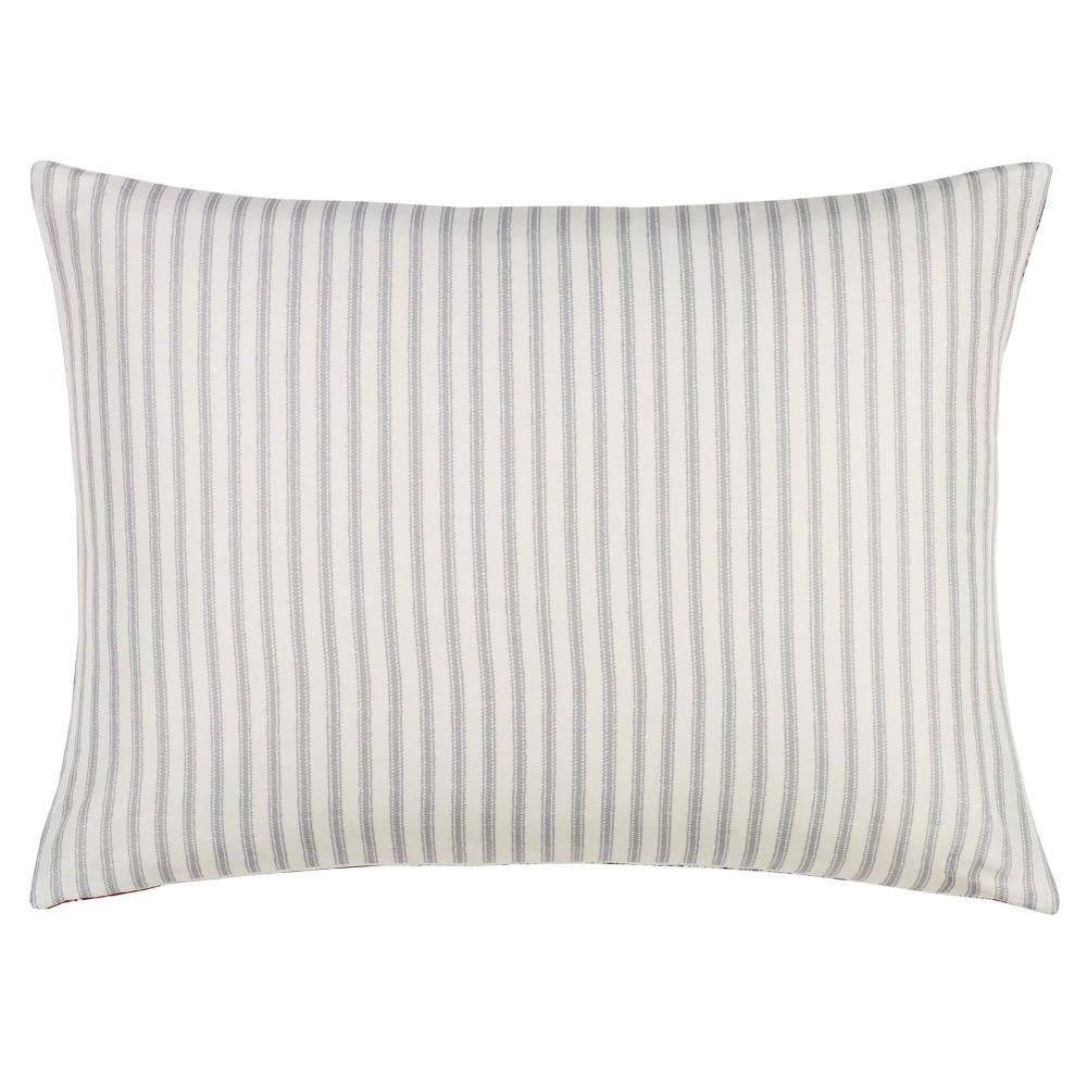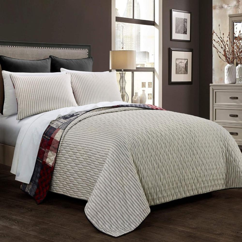 Quilted 3-piece reversible bedding set featuring a series of outdoor motifs, check and geometric elements arranged in a patchwork pattern. Colours include red, light and dark grey, black, and off white. Reverses to a simple stripe and comes with a free tote bag. Easy care and ultra soft bedding set.